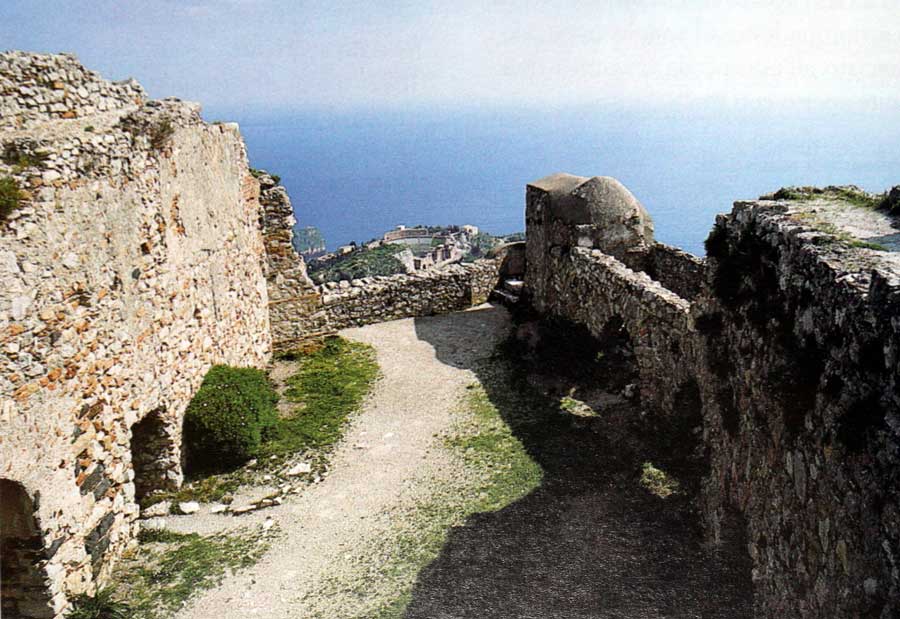 Il Borgo di Taormina, sorto lungo i fianchi della rocca del “Tauro”, fu uno dei più importanti capisaldi della resistenza cristiana in Sicilia durante la conquista araba. L’abitato venne espugnato dai musulmani una prima volta nel 902 e il Castello, di epoca bizantina, fu l’ultimo a capitolare. Il Gran Conte Ruggero assediò Taormina nel 1077-78 e la espugnò. Risale al 1150 la descrizione di Muhammad al-Idrisi, un geografo e viaggiatore arabo incaricato da re Ruggero II Palermo di redigere una raccolta di carte geografiche dal titolo comunemente inteso di “Libro di re Ruggero”, che ricorda “Tabarmin” come “[...] fortezza difendevole, in sito erto ed eccelso, uno dei più celebri castelli primitivi e delle più nobili città vetuste fondata in un monte che sovrasta il mare [...]”. Solo Ugo Falcando, nella seconda metà del XII secolo, separa l’abitato dal Castello vero e proprio “in ardua rupe positum”.  Nel 1240 il Castello fu annoverato da Federico II di Svevia tra i castra exempta e affidato a Paolo de Ocra.  Nel 1274 era reggente Henri de Fer e, in quanto demaniale, il Castello in mano angioina venne assediato durante la guerra del Vespro del 1282. Sotto gli aragonesi fu affidato, nel 1297, a Berengario de Orioles già barone di Raccuja. Michele da Piazza, nel 1353, definì “inferius” il Castello di Taormina, al fine di distinguerlo dalle limitrofe fortificazioni di Castelmola, ubicate ad una quota più alta. Verso la metà del XIV sec. la rocca risultava occupata da alleati di Enrico il Rosso ma il Parlamento siciliano, riunitosi a Siracusa, proclamava nel 1398 Taormina e il relativo Castello “in perpetuum de Demanio”.