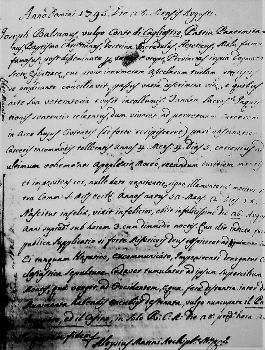 Nato a Palermo il 2 giugno 1743 nel quartiere di Ballarò dove ancora esiste la casa natale in vicolo Conte Cagliostro, il padre morì poco dopo la nascita. Affidato all’orfanotrofio di San Rocco, da Palermo fugge dopo aver truffato un orafo e ripara a Messina, nel 1766. Si trasferisce a Roma dove sposa Lorenza Serafina Feliciani, figlia di un orafo. La sua attività di falsario, denunciata dal suocero, lo costringe a fuggire con la moglie a Bergamo, quindi in Francia, ad Aix-en-Provence. Inizia la sua frenetica esistenza con spostamenti in tutt’Europa: Cagliostro fornisce a pagamento predizioni sui numeri del lotto; evoca entità spiritiche; ha visioni tramite l’”idromanzia”; si professa taumaturgo; fonda il massonico “Rito Egizio”. Nella notte del 27 dicembre 1789 viene rinchiuso in Castel Sant’Angelo a Roma con le gravissime accuse di esercizio della massoneria, della magia, del lenocinio, di truffa e falso, reati punibili con la pena di morte. Trascinato davanti ai giudici del Sant’Uffizio, il 14 dicembre 1790 scrive al Papa una lettera di pentimento dove implora la sua clemenza. Il 7 aprile 1791 giunge la sentenza commutata nel carcere a vita e per Cagliostro si spalancano le porte della fortezza di San Leo che lascerà solo dopo la morte.