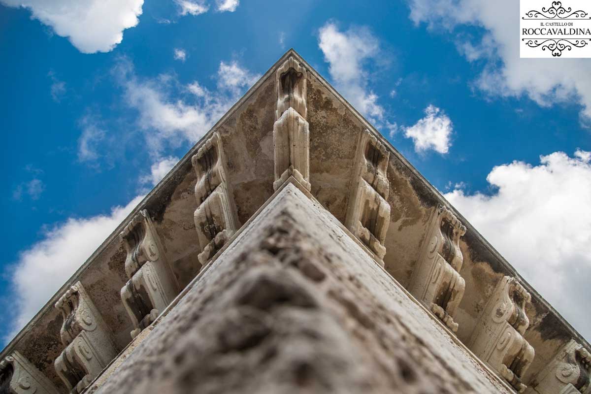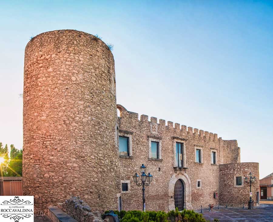 Il Castello, com’è adesso, può riferirsi alla fine del sec. XV, cui allude anche il portale ogivale d’ingresso. A pianta quadrangolare, rimangono due torri angolari circolari ma, verosimilmente, altre due dovevano essere innestate sul prospetto ad ovest. Sull’autore del progetto di ampliamento cinquecentesco per il Palazzo baronale residenziale, si sono fatti i nomi del fiorentino Camillo Camilliani e del cefaludese Jacopo Del Duca. Il primo è da escludere perché architetto militare che, peraltro, era impegnato nel 1583-84 in giro per la Sicilia per rilevare le torri di avvistamento e progettarne di nuove. L’attribuzione a Jacopo Del Duca si basa su certe affinità compositive con la sua Tribuna di San Giovanni di Malta a Messina. Non è stato tenuto in considerazione il carrarese Andrea Calamech che potrebbe, invece, esserne autore, soprattutto per l’uso del bugnato da lui applicato nel Palazzo Balsamo del Principe di Roccafiorita (1580 circa) e nell’Ospedale Maggiore (1571-77) a Messina, bugnato che caratterizza fortemente il Palazzo di Roccavaldina. Si tenga anche conto che Andrea Calamech fu a Roccavaldina nel 1566 per realizzare la statua marmorea della “Madonna delle Grazie" nel Duomo.