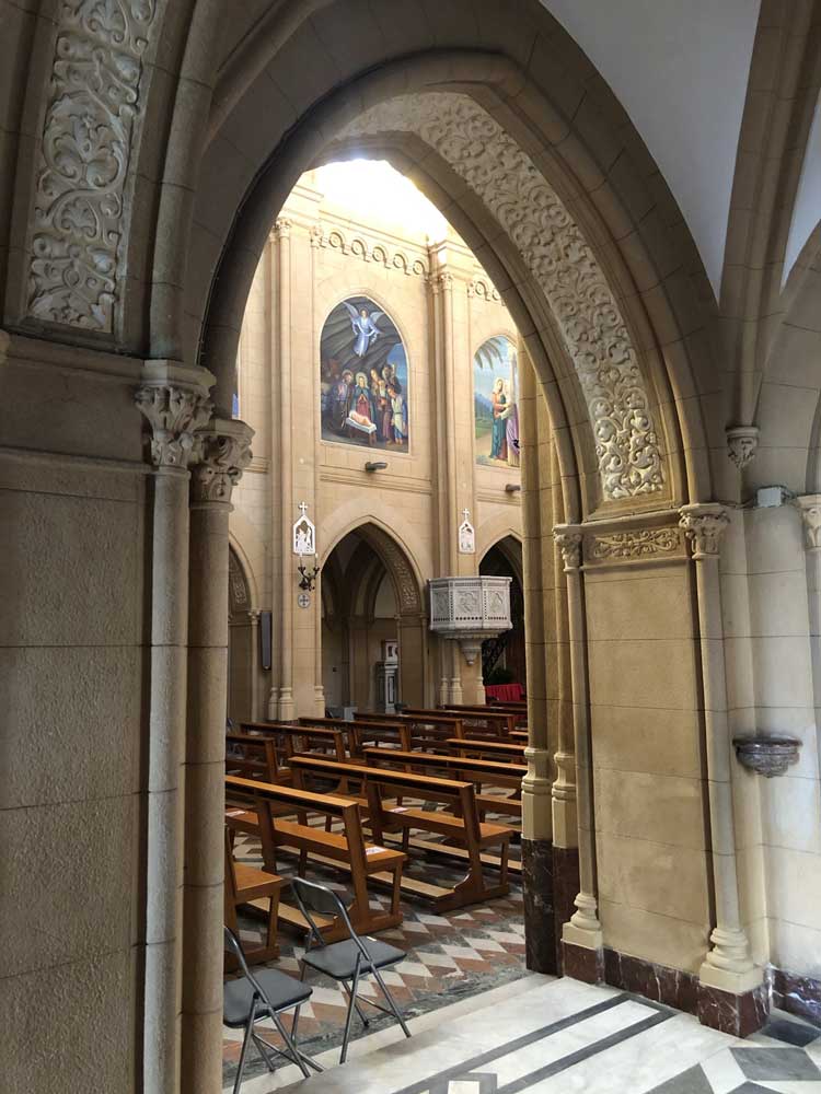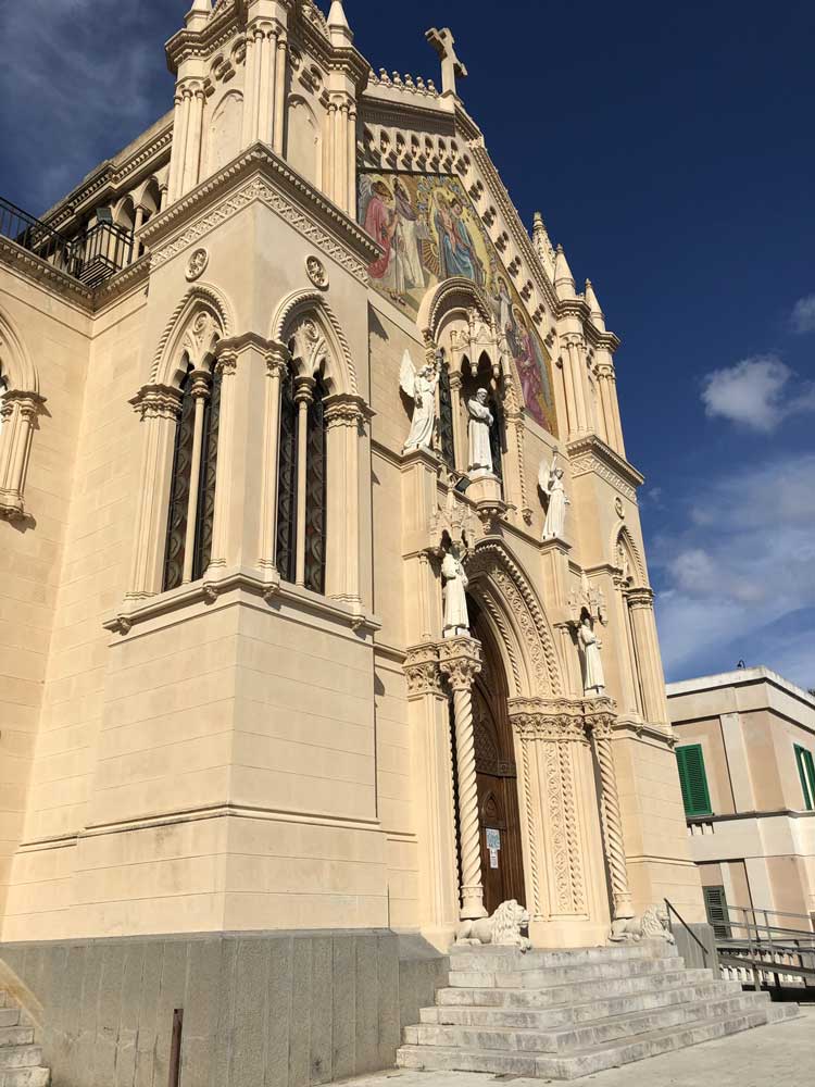 Sorge in posizione panoramica sul colle che anticamente era detto dell’Oliveto e mentre la vecchia chiesa affacciava sull’antica via delle Mura, mortificata e nascosta, quella attuale si affaccia sulla strada di circonvallazione, dominante la sottostante vallata del viale Boccetta e anticipata da una scalinata monumentale a doppia rampa di grande effetto scenografico. Venne realizzata innestandola a quella distrutta dai bombardamenti la notte del 7 aprile 1943 riutilizzando quasi tutte le strutture portanti in cemento armato. L’architettura si ispira al gotico con due campanili affiancati alla facciata, pinnacoli, finestre bifore e trifore e edicole con statue. Anche l’interno è interamente in stile gotico con imponenti ed alti archi ogivali nella navata centrale lunga 40 metri e larga 10 e nelle due navatelle laterali dove, le ogive degli archi, sostengono volte a crociera costolonate. La copertura a spioventi rivestita in legno conferisce eleganza e al tempo stesso austerità a tutta la composizione spaziale. A progettare la Chiesa fu l’arch. Filippo Rovigo, molto noto a Messina per le sue numerose realizzazione d’architettura, con la direzione lavori dell’ing. Giovanni Crinò.