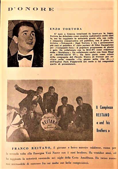 Il 28 settembre 1958, a Gesso, si teneva a battesimo la prima edizione della “Rassegna Voci Nuove”. Era stato l’E.R.A.C. (Ente Ricreativo Artistico Culturale) le cui anime erano Stefano Feminò, Luciano Ordile e Giacomo Sicari, ad organizzare una kermesse musicale che ben presto si sarebbe rivelata una manifestazione d’eccellenza in Italia. Palcoscenico, così come per “Ibbisu Village Fest”, il sagrato e la scalinata della monumentale Chiesa Madre di Sant’Antonio Abate. Nel 1960 il presentatore fu Nuccio Costa, nel 1961 Franca Ferrari “della Radiotelevisione” e nel 1962 Mario Di Giglio, “polifonico artista della Televisione Italiana”. Ad accompagnare i concorrenti, udite! udite! addirittura il complesso di Franco Reitano and his Brothers con un Mino Reitano agli esordi. Per parafrasare la “perla dello Jonio”, Taormina, Gesso diventava “la perla dei Peloritani” e si poteva permettere, dal 13 al 15 settembre 1963, di ospitare sul palco nientepopodimeno che Myriam Del Mare, Henry Wright (il cantante della bellissima “Abat-jour”), Paula e il grande, indimenticabile Enzo Tortora quale presentatore. E naturalmente, il complesso Reitano “and his Brothers”, ormai di casa a Gesso.