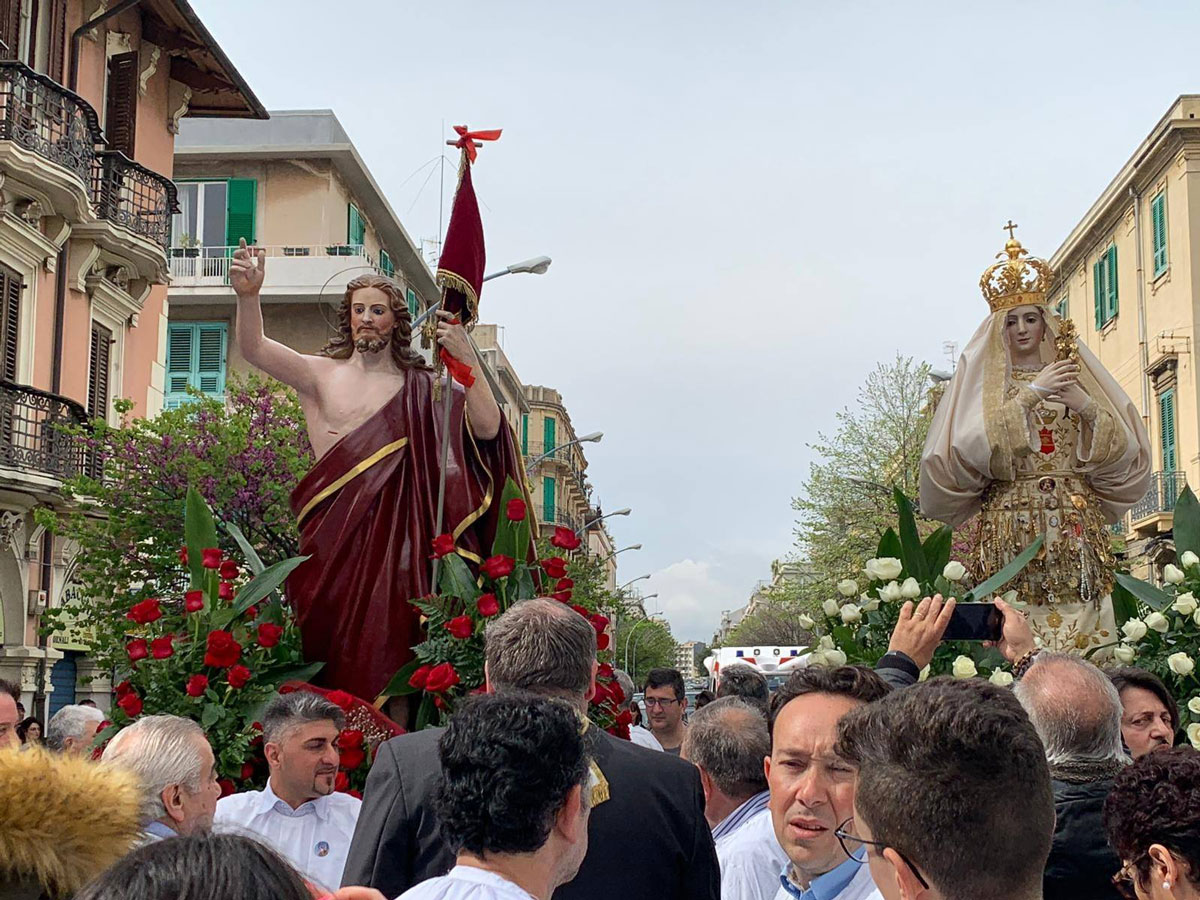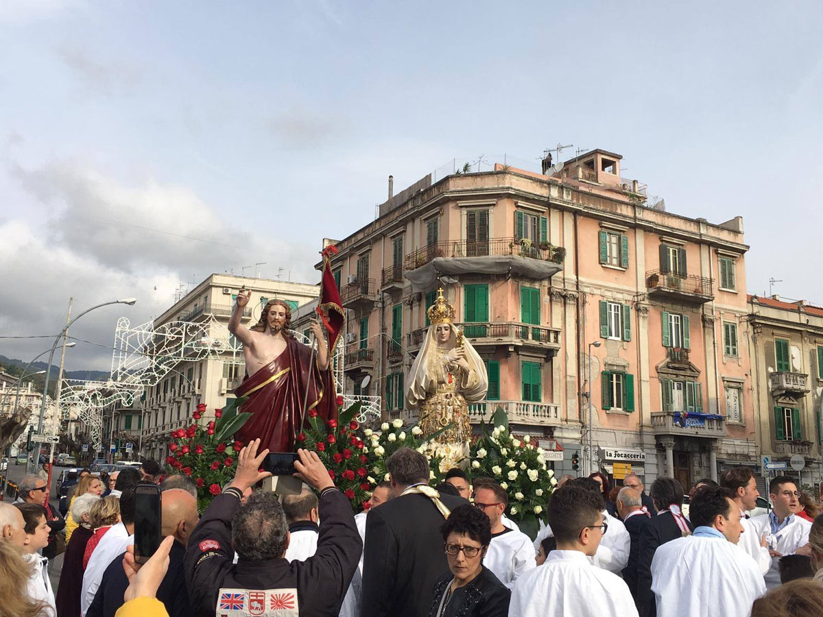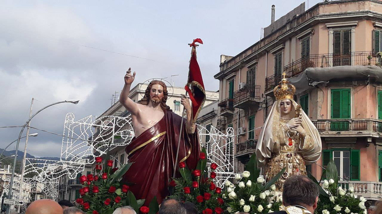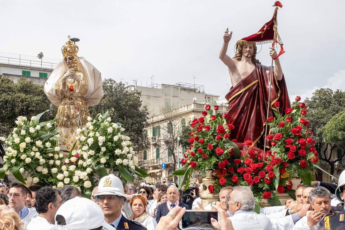 Il corteo, che rievoca la “cerca” della Madonna del suo Figlio risorto e che si conclude con l'incontro (“’a giunta”), si è mantenuto intatto fino ai nostri giorni, con l'unica variante del luogo d'incontro. Prima del 1908 le due statue partivano da chiese diverse, una era quella di San Valentino che custodiva il simulacro del Cristo Risorto, e si ricongiungevano da strade diverse in piazza Duomo col sottofondo degli spari di mortaretti. Qui la Madonna, nel riconoscere il figlio, buttava giù il manto da dove uscivano molti uccelletti. Gaetano La Corte Cailler, in un suo scritto del 1914, così descrive il momento culminante della sacra rappresentazione: “Nel Duomo, intanto, c'è la grande funzione di Pasqua alla quale assisteva in forma solenne il Magistrato cittadino, cioè il Senato: terminata la funzione, le due statue si incontravano nella piazza finalmente […] La Madonna, nel riconoscere il Figlio, butta giù il manto di lutto, e da quel manto escon fuori molti uccelletti, allegri per l'ottenuta libertà. Le due statue quindi percorrono lietamente le vie, accompagnate da musiche inneggianti alla resurrezione del Signore, e poi tornano in chiesa, a Portalegni, per dormirvi il sonno di un altro anno”.