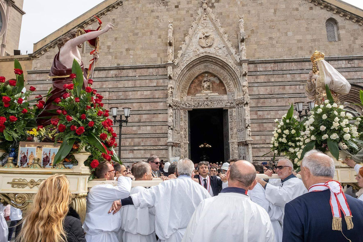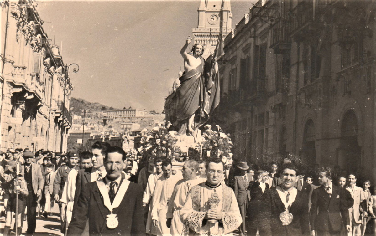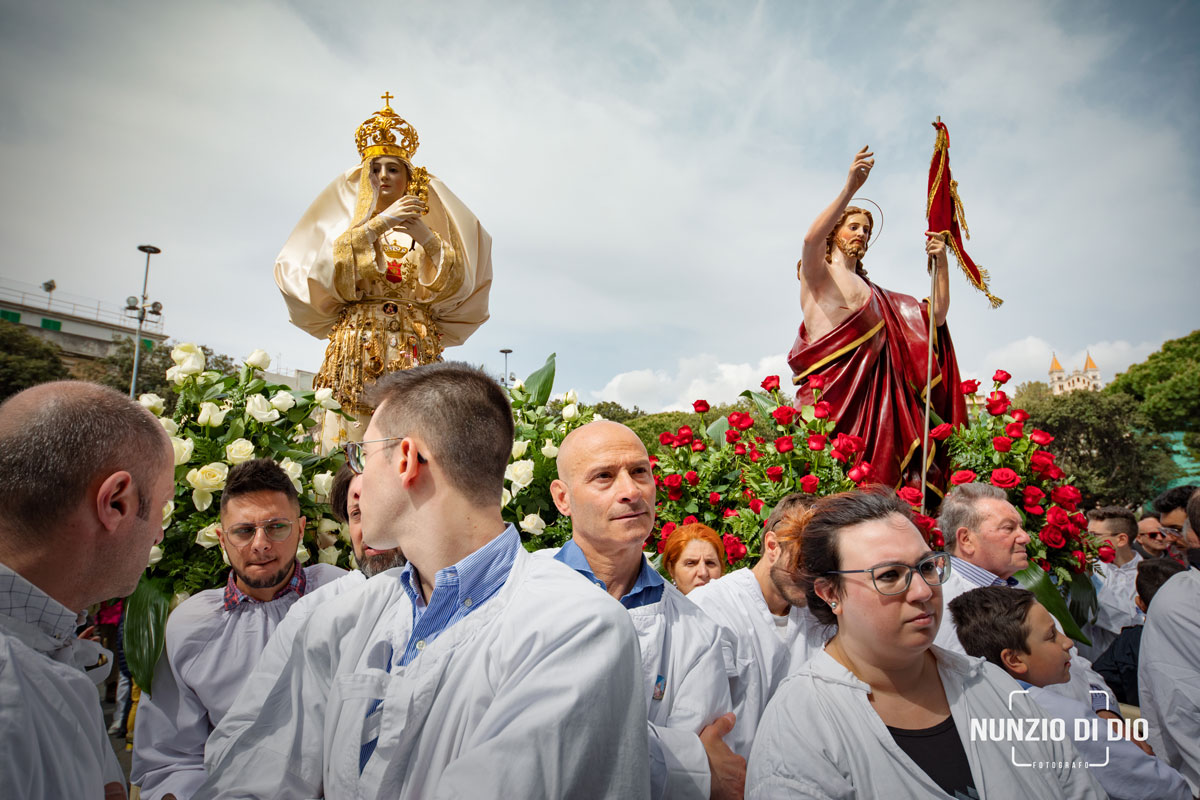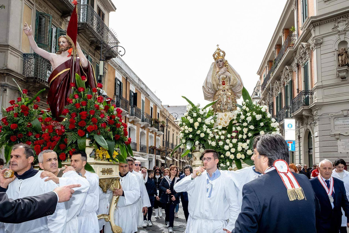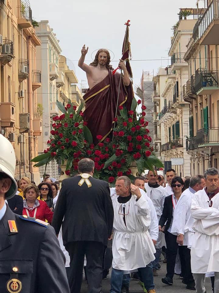 Il corteo, che rievoca la “cerca” della Madonna del suo Figlio risorto e che si conclude con l'incontro (“’a giunta”), si è mantenuto intatto fino ai nostri giorni, con l'unica variante del luogo d'incontro. Prima del 1908 le due statue partivano da chiese diverse, una era quella di San Valentino che custodiva il simulacro del Cristo Risorto, e si ricongiungevano da strade diverse in piazza Duomo col sottofondo degli spari di mortaretti. Qui la Madonna, nel riconoscere il figlio, buttava giù il manto da dove uscivano molti uccelletti. Gaetano La Corte Cailler, in un suo scritto del 1914, così descrive il momento culminante della sacra rappresentazione: “Nel Duomo, intanto, c'è la grande funzione di Pasqua alla quale assisteva in forma solenne il Magistrato cittadino, cioè il Senato: terminata la funzione, le due statue si incontravano nella piazza finalmente […] La Madonna, nel riconoscere il Figlio, butta giù il manto di lutto, e da quel manto escon fuori molti uccelletti, allegri per l'ottenuta libertà. Le due statue quindi percorrono lietamente le vie, accompagnate da musiche inneggianti alla resurrezione del Signore, e poi tornano in chiesa, a Portalegni, per dormirvi il sonno di un altro anno”.