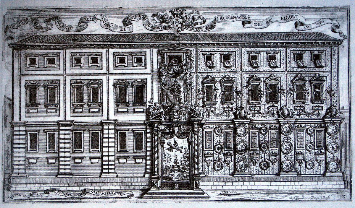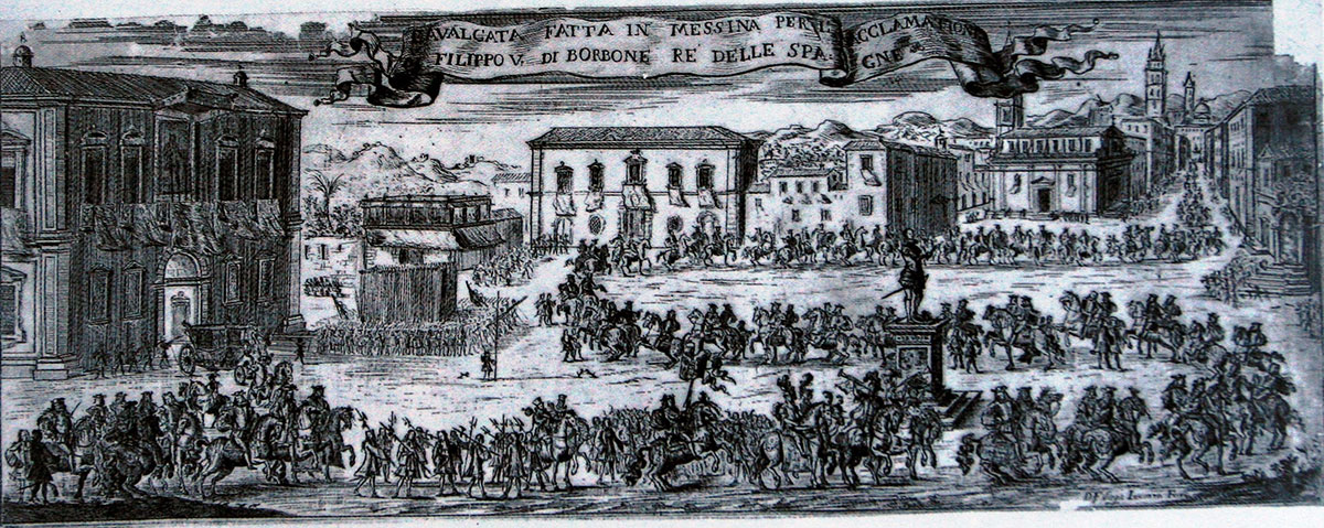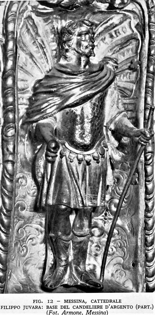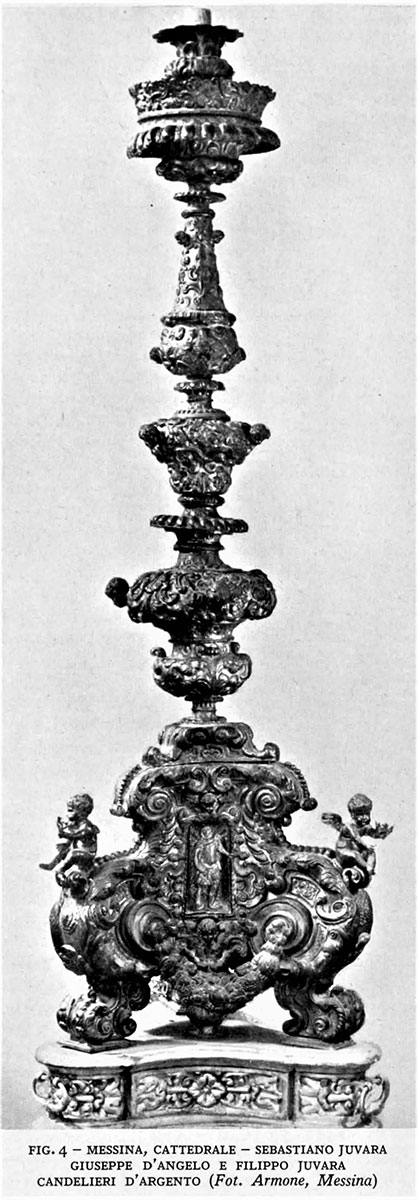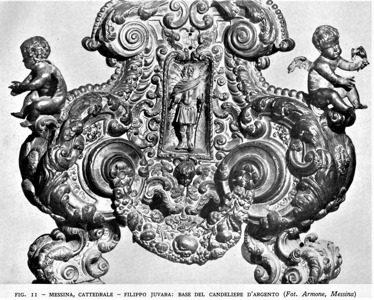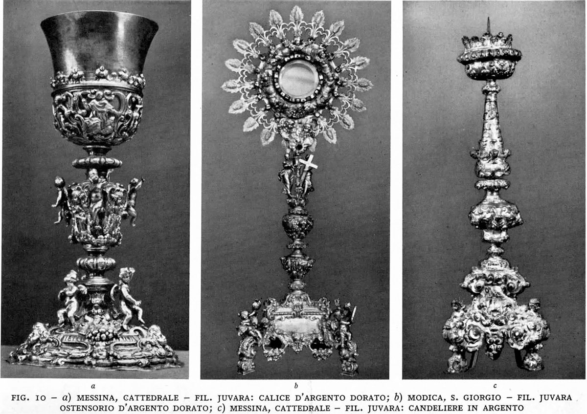 Per l’ascesa al trono di Filippo V di Borbone in tutte le strade più importanti di Messina, in segno di giubilo, vennero eretti archi trionfali, baldacchini, obelischi, macchine sceniche, sculture in legno. Tutti gli apparati progettati da Filippo Juvarra furono dallo stesso riprodotte in otto splendide incisioni in rame nel volume di Nicolò Maria Sclavo, stampato da Vincenzo D’Amico nel 1701, dal titolo “Amore ed Ossequio di Messina in sollennizzare l’acclamatione di Filippo Quinto di Borbone…”. La produzione argentiera di Juvarra è per la prima volta documentata in un calice in argento dorato per il Duomo di Messina, firmato e datato 1695, fittamente decorato da volute, testine alate, puttini, ghirlande di frutti in aderenza al caratteristico gusto tardo barocco dell’epoca. Sempre per la Cattedrale di Messina, insieme al fratello Francesco ed altri argentieri partecipò alla realizzazione di otto candelieri in argento per l’altare maggiore (1698-1716). Di grande e spettacolare effetto sono i due candelabri sempre nel Duomo di Messina, insieme al fratello Sebastiano e a Giuseppe D’Angelo (1701), questo, come gli altri, custoditi nel Tesoro del Duomo annesso alla Cattedrale.