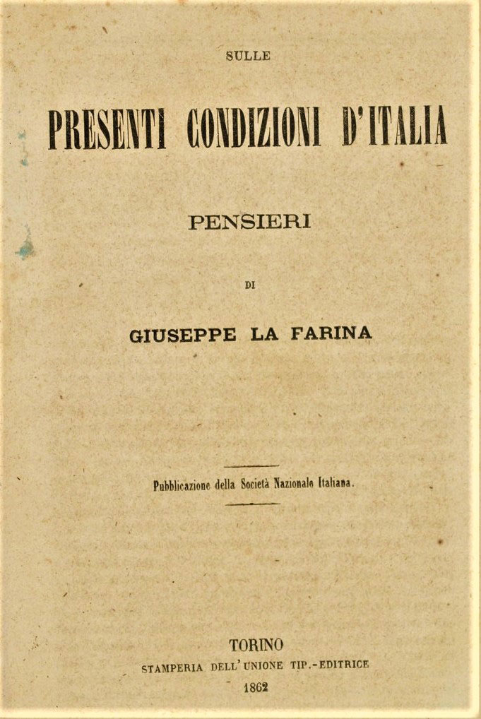 Nato il 20 luglio 1815, figlio di Carmelo La Farina, giudice della Gran Corte Criminale e fondatore e curatore del Museo Civico, a 11 anni si dedicò allo studio delle lingue straniere, lettere italiane, latine e greco. Dal 1826 al 1832 frequentò l’Accademia Carolina (elevata poi ad Università) per apprendere matematica, fisica, filosofia, chimica e anatomia. A tredici anni gli fu consentito di stare con il padre che nel 1828, per motivi politici, era stato rinchiuso nelle carceri di Palermo. Comprese, così, la sofferenza e le tribolazioni di chi si batte per un ideale che sarà la ragione più importante della sua vita. Ripresi gli studi, a diciassette anni si iscrisse al corso di Giurisprudenza e il 7 maggio 1835 si laureò all’università di Catania. Esercitò poco l’attività di avvocato e si dedicò agli studi storici e letterari pubblicando un gran numero di articoli, saggi, recensioni, racconti, poesie e scritti politici. Ma il suo interesse preminente era quello di portare aventi ideali liberali, di progresso e di redenzione della Patria. Idee che non abbandonerà mai fino alla morte che lo coglierà a Torino per apoplessia cerebrale, alla prematura età di 48 anni, il 5 settembre 1863.