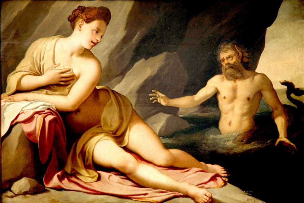 Viveva a Messina, nel IV sec. a.C., un pescatore di nome Glauco bellissimo come un essere divino. Era solito pescare con la “sciabbica”, rete a maglie strette, al largo dello Stretto in direzione di Capo Peloro. Quando traeva nella barca le reti, queste erano gonfie di pesci e tornando poi a riva, le sirene accorrevano a frotte per vederlo e cercare di ammaliarlo con i loro canti, inutilmente. Un giorno cambiò zona e dopo essere tornato a riva con la barca carica di pesce, vuotò una rete su un prato ma appena i pesci furono a contatto con l’erba, guizzarono via e con grandi salti si rituffarono in mare. Stupito alla vista di tale prodigio, dopo un’altra prova con un’altra rete, Glauco si convinse che quell’erba possedeva prodigiosi poteri e, vinto dalla curiosità, se ne portò un ciuffo alla bocca per assaggiarla. Via via che masticava e inghiottiva sentiva come un senso di freddo mentre una irrefrenabile metamorfosi si compiva nella sua persona; le gambe si atrofizzarono e unendosi si trasformarono in coda, le braccia in pinne e una fitta squamatura coprì in poco tempo il suo corpo: era diventato un pesce. Si tuffò in mare e così cadde per sempre nel dominio delle sirene.