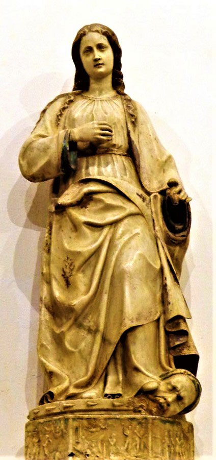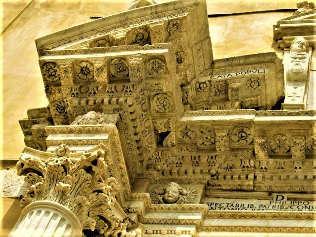 La facciata è caratterizzata da un bel Portale marmoreo recante l'iscrizione "MONSTRA TE ESSE MATREM MDCCXXV" (1725) (“Dimostra d’esser madre”, dal canto “Ave Maris Stella”). Sopra una targa con la data MDCCLXXVI (1776), in alto al centro, la nicchia con volta a conchiglia ospita la statua della Vergine su un basamento d'angeli alati. Nel prospetto est si apre un Portale marmoreo dove sopra l'elaborato cornicione è una targa posta sotto il regno di Filippo IV di Spagna MDCXXVIII (1628). Una nicchia sommitale custodisce una Vergine Coronata orante identificabile con l'Immacolata Concezione. Accanto sulla destra, la targa marmorea del 1639 di Filippo IV di Spagna elogiante i Giurati Castrensi, sormontata da tre aquile marmoree. Le laterali sono degli Aragona di Sicilia e quella centrale reca lo stemma in uso dal 1580 fino al 1700 nel Regno di Spagna, in questo caso riferito a Filippo IV. Gli stemmi interni si riferiscono alle regioni sotto l’influenza iberica. Sul tutto spicca il collare dell’Ordine del Toson d’Oro, istituito il 10 gennaio 1429 da Filippo III di Borgogna a Bruges con il compito di diffondere la religione cattolica e poi passato alla Casa Asburgo.