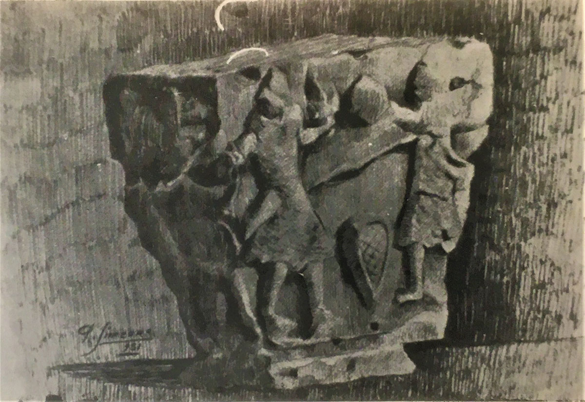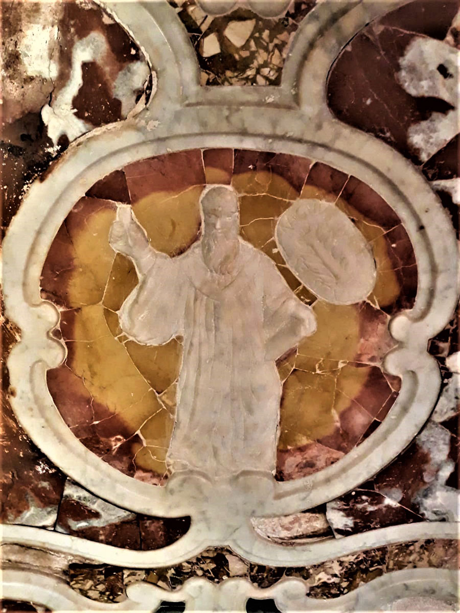 Nel corso della demolizione e ricostruzione interna della chiesa vennero rinvenuti frammenti di gesso con decorazioni a figure, utilizzati come materiale da costruzione. I frammenti furono recuperati dal prof. Enrico Calandra e dal prof. Francesco Basile e consegnati al Museo, allora Nazionale, di Messina, dove oggi si conservano. Questi frammenti, dei quali Stefano Bottari pubblicò i disegni eseguiti nel 1931 da Riccardo Simeone, raffigurano una scena di combattimento tra un guerriero normanno, riconoscibile dall’armatura a fitte maglie con stretta tessitura e dall’elmo e due arabi, anch’essi con armatura ma a maglie più larghe e copricapo tipicamente islamico. Il guerriero normanno afferra con una mano le briglie di un cammello sulle cui gobbe è in piedi un avversario in atto di scagliare la lancia, e con l’altra alza lo spadone per difendersi. Nello stesso tempo l’avversario, facendosi schermo con lo scudo, drizza la lancia per colpirlo. In altro frammento un guerriero arabo isolato combatte in mezzo alla mischia di normanni, cavalli e cammelli. Un capitello, infine, raffigura la scena di un corpo a corpo fra due guerrieri, arabo e normanno. Tutte le decorazioni, presentano scudi normanni lanceolati in basso.