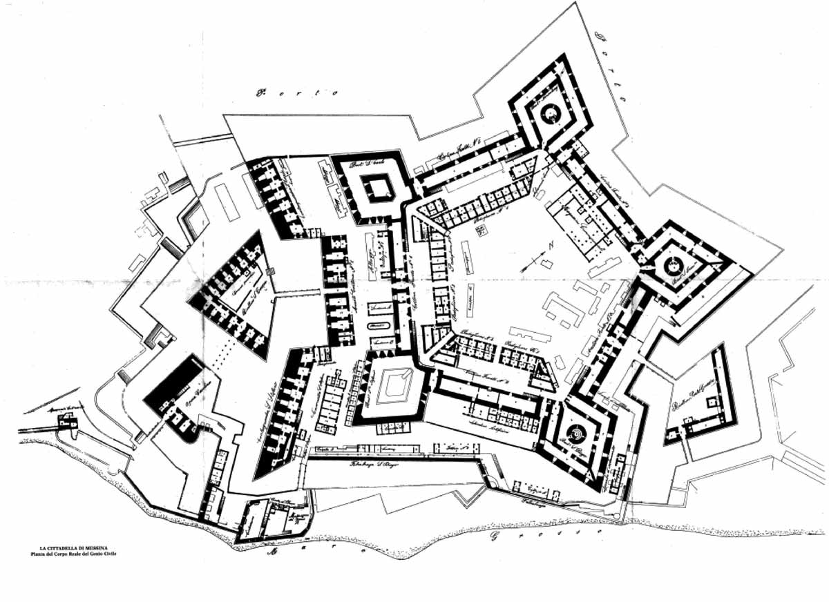 Circondata dall’acqua per tutto il suo perimetro e ulteriormente rafforzata sui fronti nord e sud da due “rivellini” (bastioni a cuneo avanzati), costituiva l’immediata traduzione dei caratteri strategico-militari della fortezza imprendibile rinascimentale. Al pari di tutte le architetture militari concepite come strutture rigidamente funzionali ed essenziali, nella Cittadella venne concentrata, in maniera eclatante, tutta la variegata ed esplosiva tipologia decorativa nei portali con le caratteristiche decorazioni a spirali, chiocciolette di gusto spagnolesco eseguite dai maestri Biundo, Amato e Viola, già noti nel panorama artistico del tempo come “lapidarum incisores messanenses”. Esemplare in tal senso, nella sua magniloquenza formale e compositiva, è la “Porta Grazia”, dal 1961 sistemata in piazza Casa Pia. Nei cinque bastioni emergenti (“Norimberga”, “S, Carlo”, “S. Francesco”, “S. Stefano” e “S. Diego”) veniva ulteriormente ribadita l’affermazione del “sistema bastionato italiano” quale diretta conseguenza dell’avvento delle artiglierie che avevano già fatto tramontare, per sempre, la difesa medievale cosiddetta “all’arma bianca”.