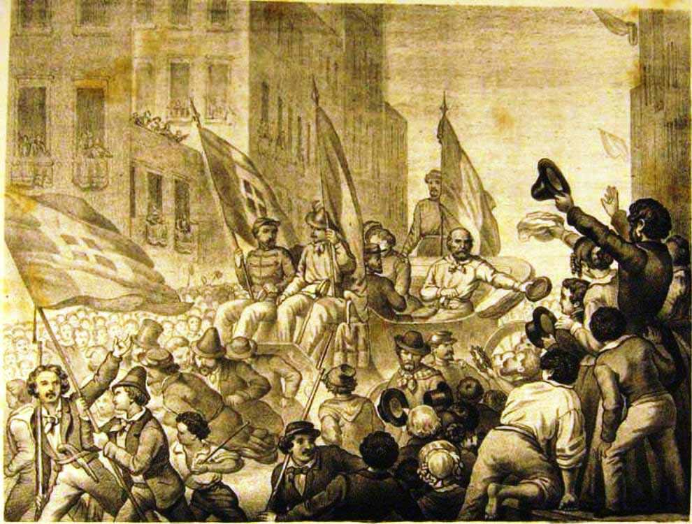 27 luglio 1860, venerdì. Giuseppe Garibaldi è sulle alture dei Colli Sarrizzo. Procede lungo la “Strada Nuova” (attuale via Palermo) e verso le tre pomeridiane giunge a Messina da Porta San leone, seguito da Nino Bixio e dal figlio Menotti con una divisione. Il Generale è con Giuseppe Sirtori, su una carrozza messa a disposizione dal barone Gioacchino Calcagno Pisano. Fra i primi ad andargli incontro è “Cammaroto”, un popolano destinato a diventare in futuro lo zimbello di tutti per le pubbliche invettive e le catastrofiche predizioni, frutto della sua mente sconvolta dalle grandi disgrazie familiari. Garibaldi gli rivolge parole cortesi e gli trasmette, involontariamente, una struggente nostalgia garibaldina che metterà in pratica con un fazzoletto rosso attorno al collo, cascante annodato sul torace che “Cammaroto” non toglierà più. L’entusiasmo del popolo è incontenibile: vengono staccati i cavalli della carrozza e Garibaldi viene condotto in trionfo per la città in festa fino al Palazzo del Gran Priorato di S. Giovanni di Malta. Acclamato dalla folla, il Generale si deve mostrare al popolo più volte dal balcone che guarda verso la villa “Flora”, oggi Villa Mazzini.