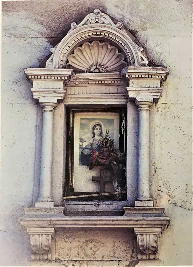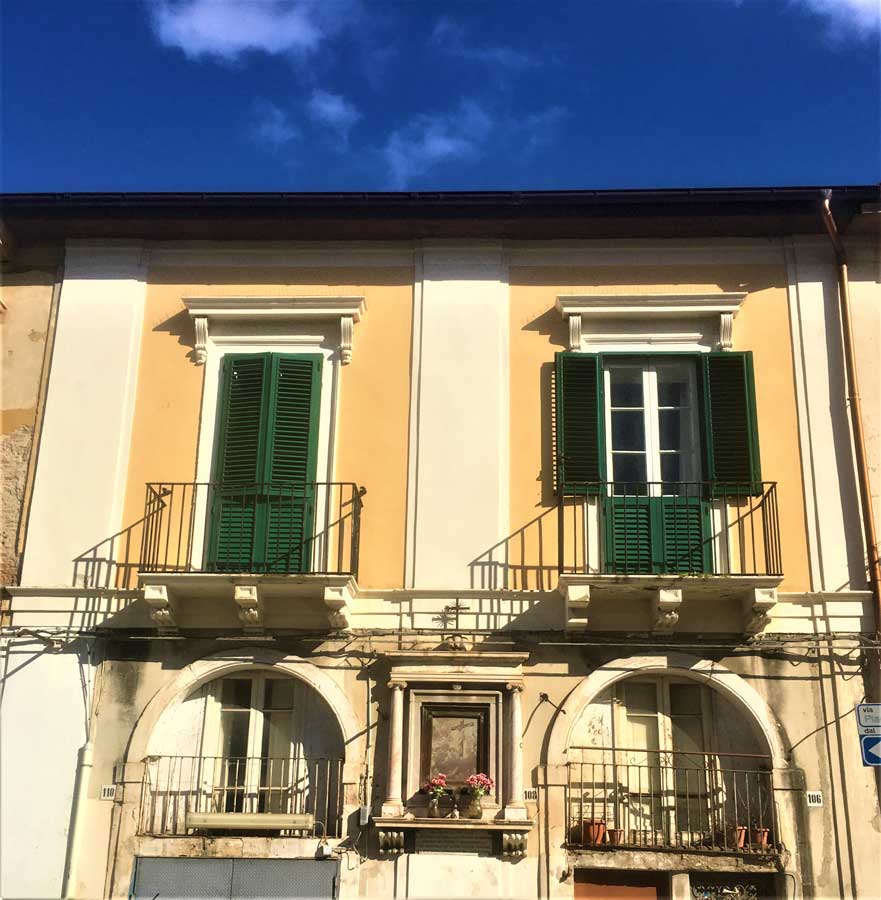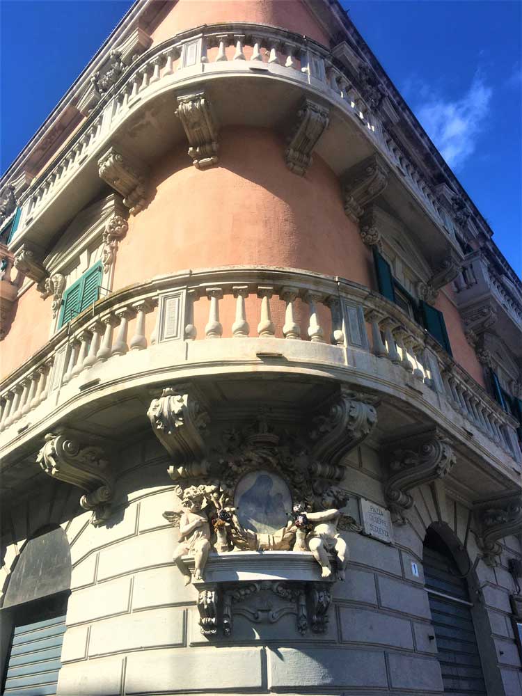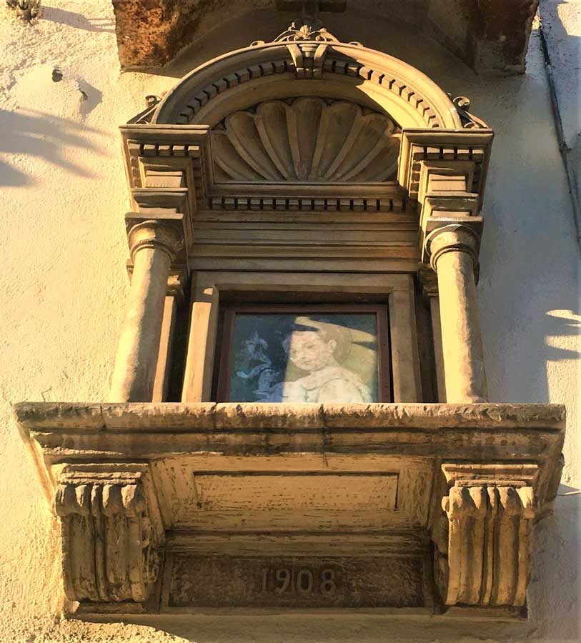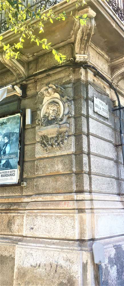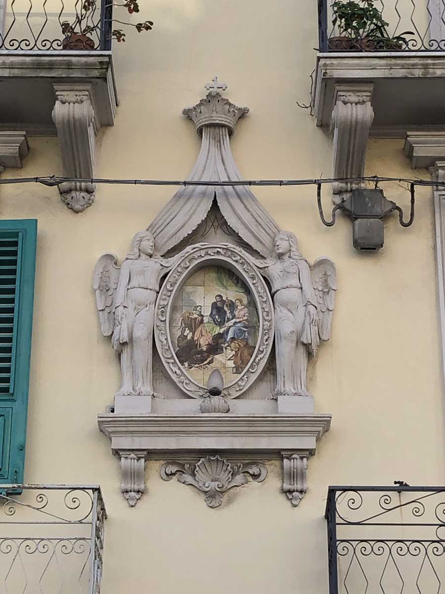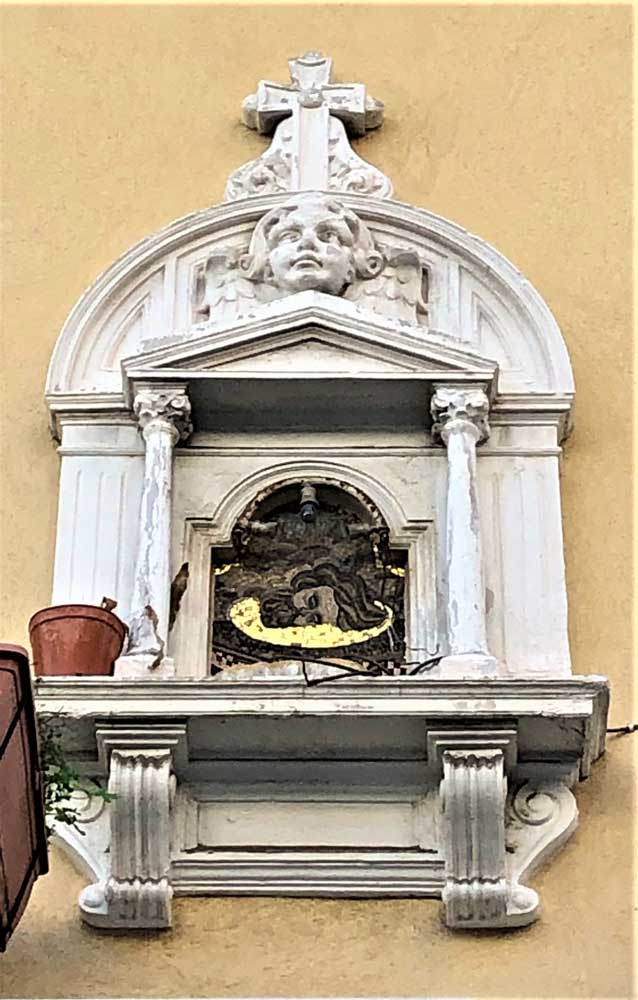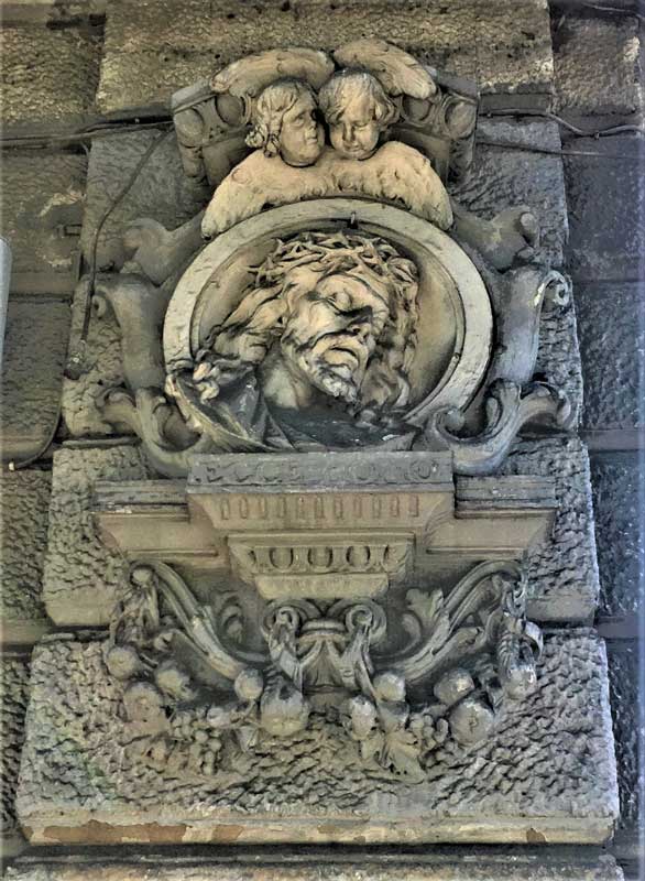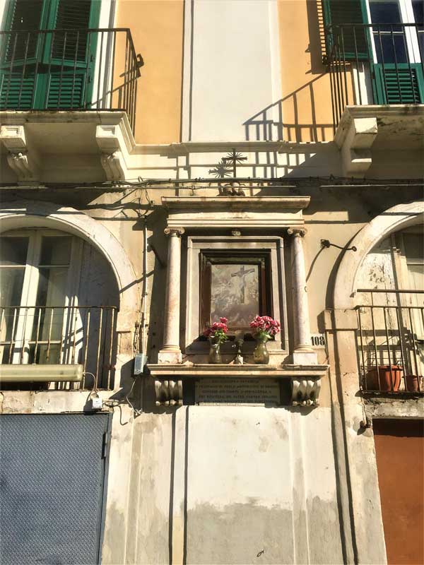 Pregevole icona devozionale raffigurante il volto di Cristo coronato di spine, si trova all’angolo di un palazzo eclettico del primo ‘900 fra il Corso Cavour e Via della Zecca. Di grande impatto emozionale i volti dei due angeli dolenti che sormontano l’icona.