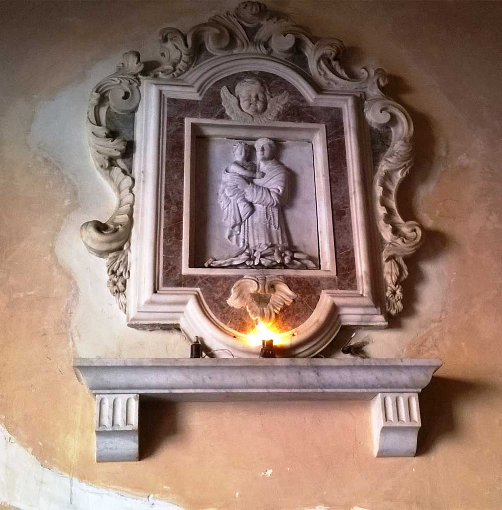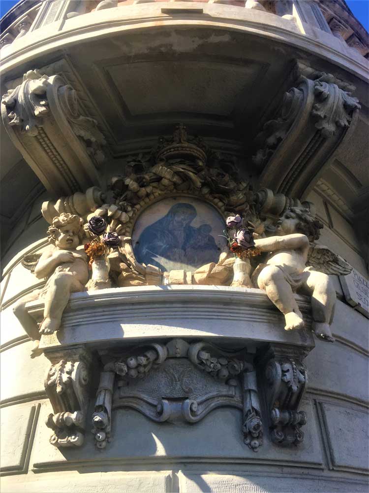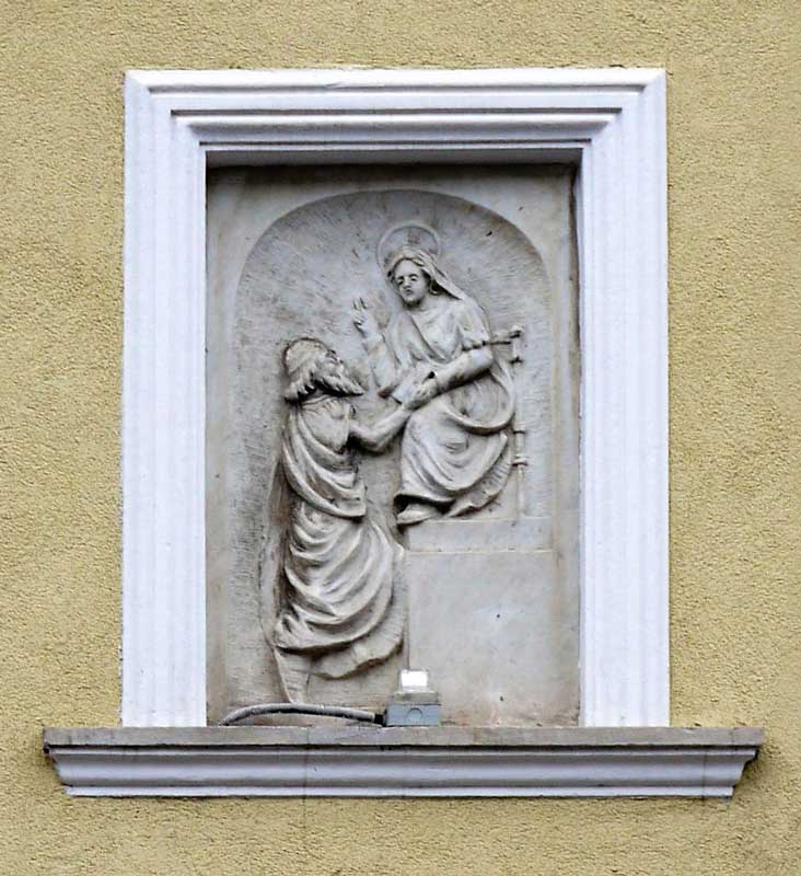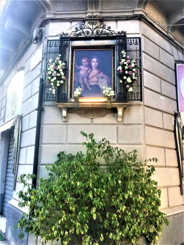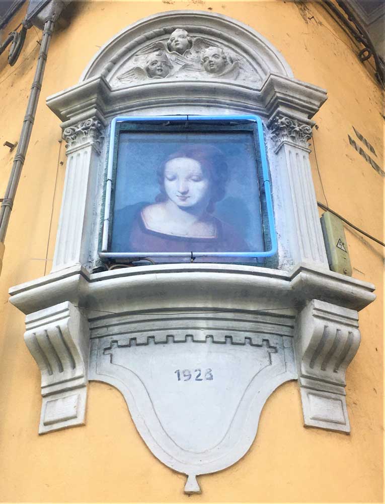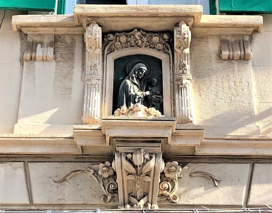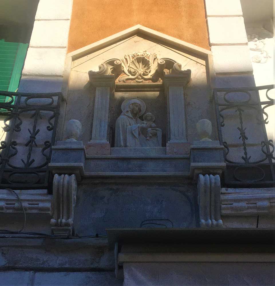 In Via San Filippo Bianchi 36, è un bassorilievo bronzeo di pregevole fattura della Madonna della Lettera col Bambino all’interno di una bella edicola in stile liberty floreale attardato.