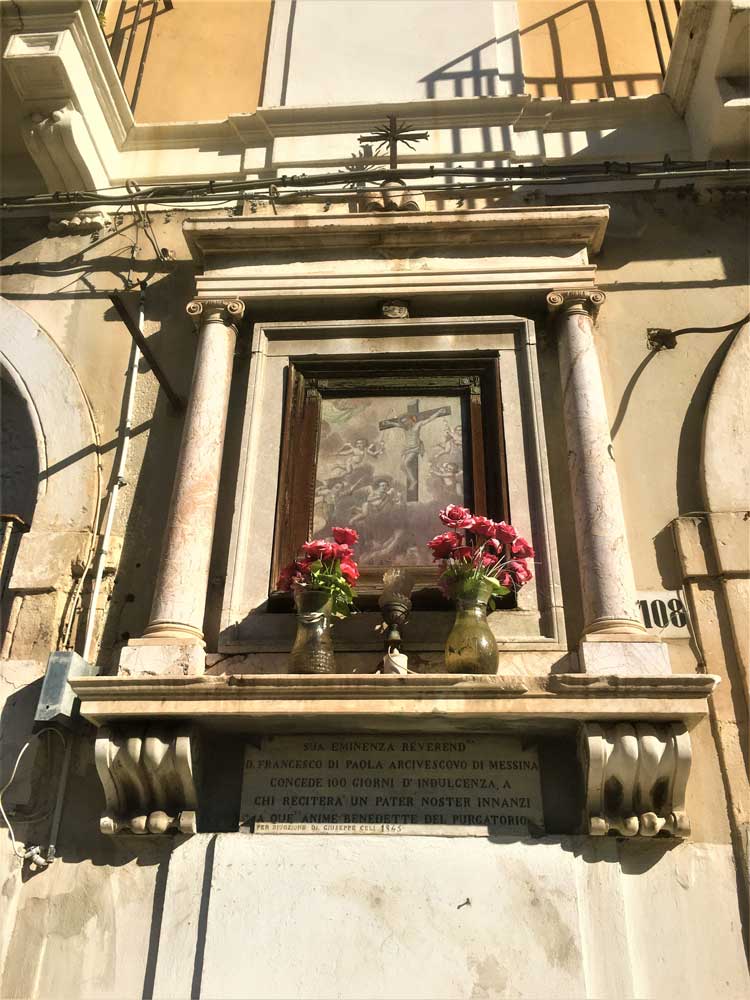 Sulla Via Placida, nell’isolato 478, è ubicata sul prospetto delle ottocentesche "case Cicala" un’Edicola Votiva realizzata per devozione da Giuseppe Celi nel 1845 con un dipinto su tavola rappresentante il Crocifisso tra le Anime del Purgatorio. Costituita da mensole montate su due colonne di marmo di San Marco D’Alunzio e sormontate da capitelli e da un architrave di marmo bianco, sotto la mensola è inserita una targa marmorea con iscrizione per le indulgenze.