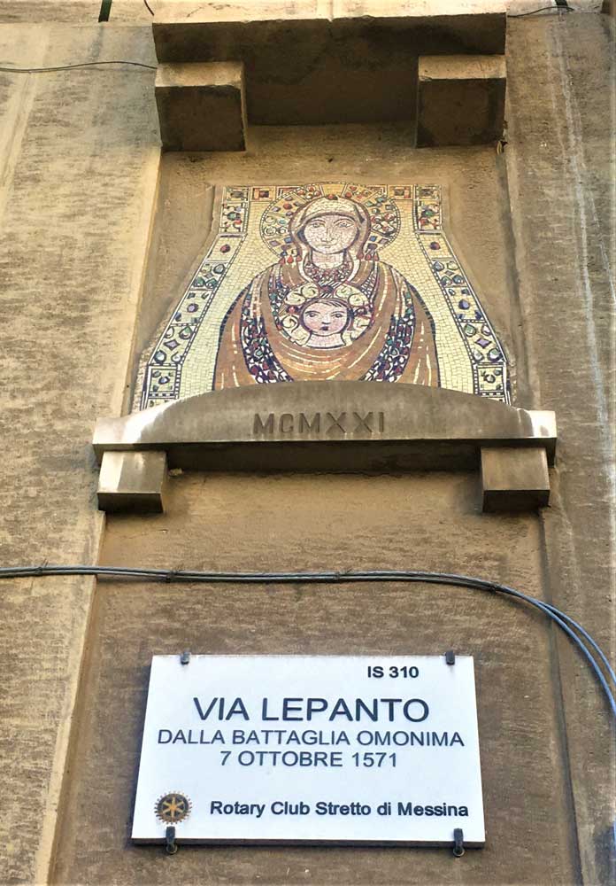 In Via Lepanto n.5, l’icona devozionale raffigura una Madonna col Bambino realizzata in mosaico in stile bizantineggiante nel 1921.