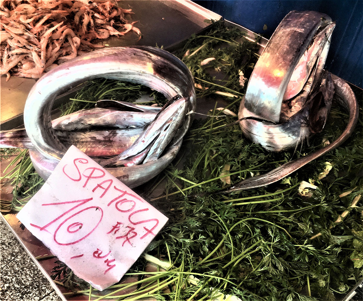 La “spatola”, nome dialettale del pesce sciabola o pesce bandiera (“Lepidopus caudatus”), è un pesce di mare dal corpo allungato e compresso ai fianchi, tipicamente nastriforme, e può raggiungere e superare i 200 cm di lunghezza per un peso massimo di 8 kg. Le “spatole” si catturano col “conzo”, detto anche “palamito” o “palangrese” costituito da una lunga lenza da fondo munita di qualche migliaia di “braccioli” (lenze verticali) con ami, posti a opportuna distanza e collegati ad un unico filo di sostegno chiamato “trave” disposto sempre in senso orizzontale. Dalle carni tenere e saporite, a Messina si cucinano ad involtini, a beccafico, fritte e in agrodolce.
