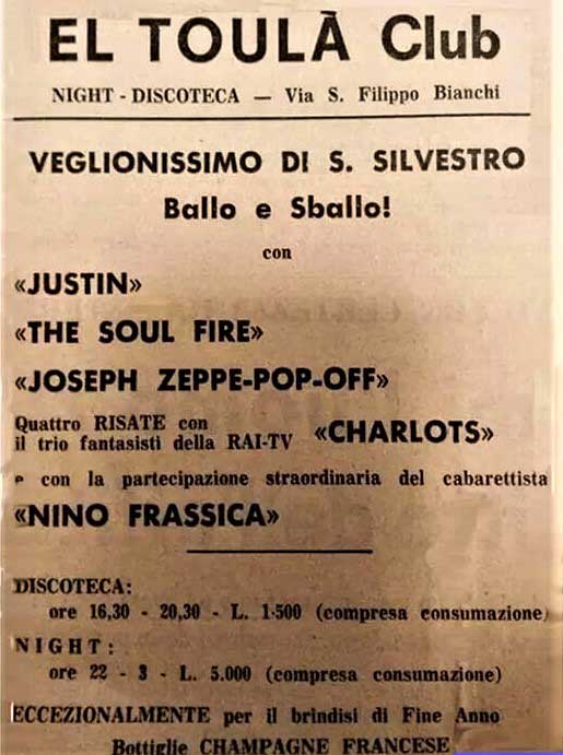 La prima discoteca a Messina nacque nel Casale di Giampilieri Marina, si chiamava la “Taverna Bianca” e fu inaugurata nel 1971 da Fred Bongusto. Vi si alternarono, poi, Peppino di Capri, Franco Califano, Riccardo Fogli, Gino Paoli e altri ancora. Per restare negli anni ’70, storici locali rimasti nell’immaginario collettivo dei messinesi erano il Ristorante-Dancing “La Macina” di Teo Aversa e il “Ritrovo Granatari”, entrambi a Granatari nella Riviera Nord. Al “Ritrovo Granatari”, in auge sin dagli anni ’60 del ‘900, fecero ballare i messinesi Eduardo Vianello con i suoi “Flippers” ma anche i casalinghi “I nuovi Delfini”. Al ”Vecchia America”, sulla Nuova Panoramica dello Stretto, alla consolle stava Zeppe (Giuseppe) Favano. In città, discoteche cult erano l’”HiFi” (divenuto poi “Rombo”) e l’”El Toulà”. La prima in un locale retrostante il cinema Lux mentre l’”El Toulà”, la prima mega discoteca del Sud Italia, all’interno del cinema Apollo. Dj d’eccezione Antonio Lo Giudice e cantanti d’eccezione, Patty Pravo, Fred Bongusto, Riccardo Cocciante, Bruno Martino, Memo Remigi e persino Lucio Battisti. Il “Blue Moon” sul Viale S. Martino chiudeva la serie delle discoteche cittadine.
