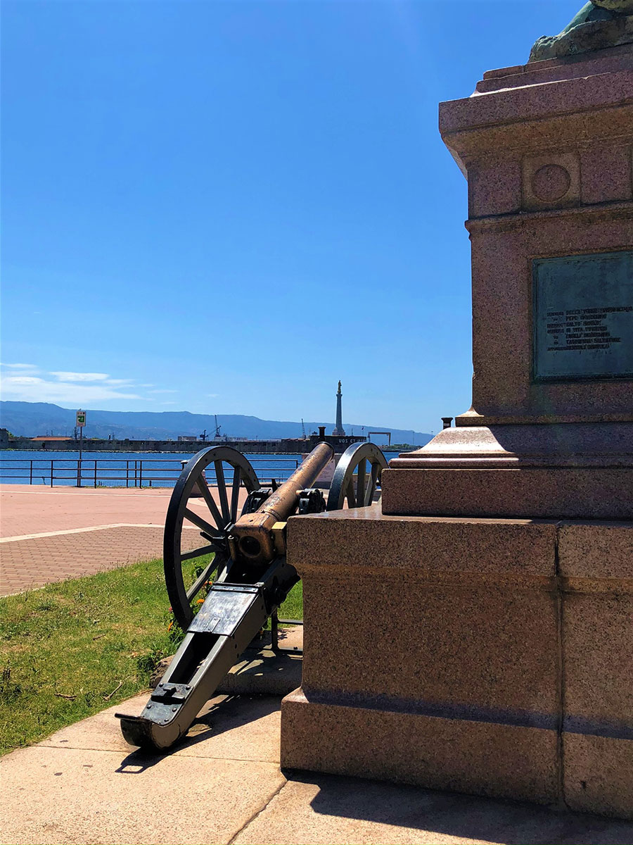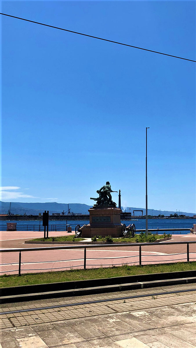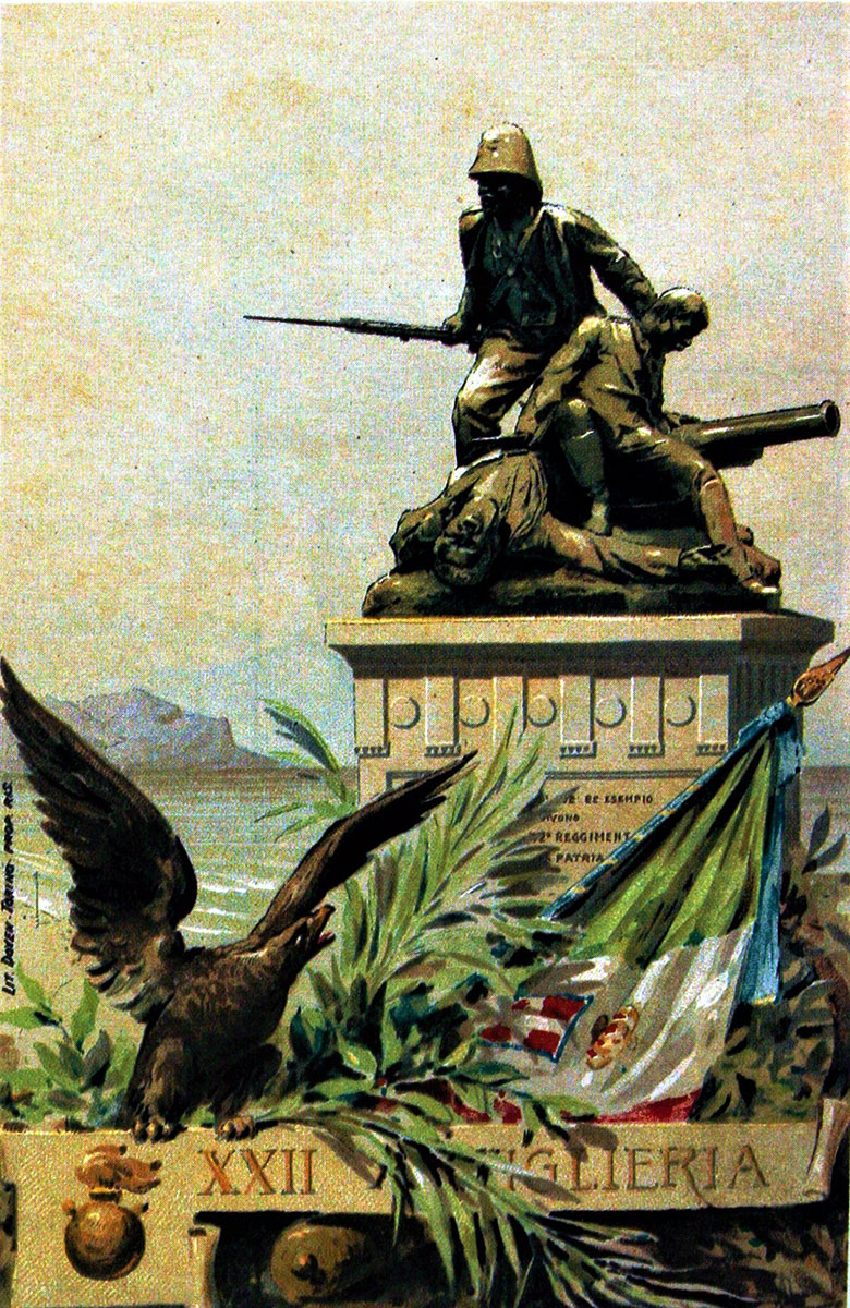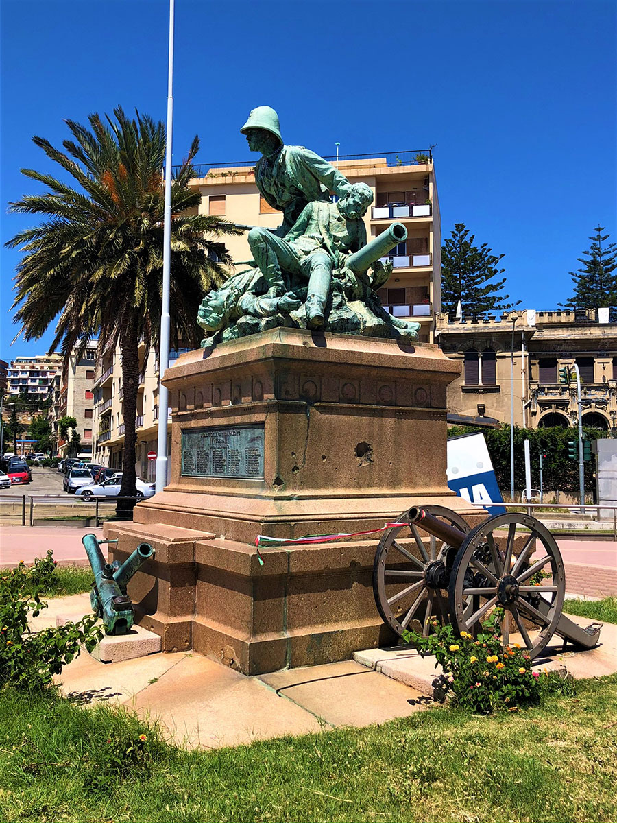 Ubicato in origine nel “Giardino a Mare”, attuale area della Fiera, nel 1935 venne spostato e ubicato nella sede attuale. Il Monumento rappresenta un gruppo di eroici soldati siciliani al comando del veneto Umberto Masotto, protagonisti di uno degli episodi più tragici della guerra d’Africa: la battaglia di Abba Carima nei pressi di Adua dell’1 marzo 1896. Fuso dalla Reale Fonderia di Torino dopo essere stato modellato a Roma nel 1896, i tre militari riprodotti sono grandi una volta e mezza il normale. La base è quadrangolare in marmo di Baveno con targhe in bronzo con i nomi degli ufficiali e dei soldati periti in quella battaglia. Dopo la seconda guerra d’Africa (1935-36), alla base del monumento furono collocati due cannoni riportati in Italia dall’Etiopia, con stampigliato i nomi di Caorso (Comune della Provincia di Piacenza) e Cardeto (Comune della Provincia di Reggio Calabria), rispettivamente fusi a Torino nel 1890 e 1891. In questo bel gruppo monumentale, l’autore riesce a riscattarsi dai limiti della retorica celebrativa, grazie ad una composizione piramidale, di forte impatto plastico-visivo, con tre momenti fondamentali in rapida successione verticale: la vita, la sofferenza, la morte.