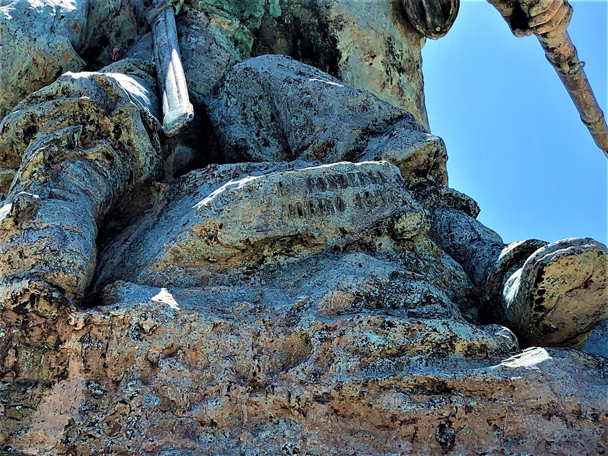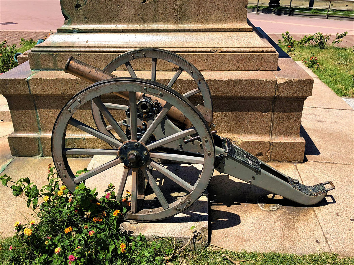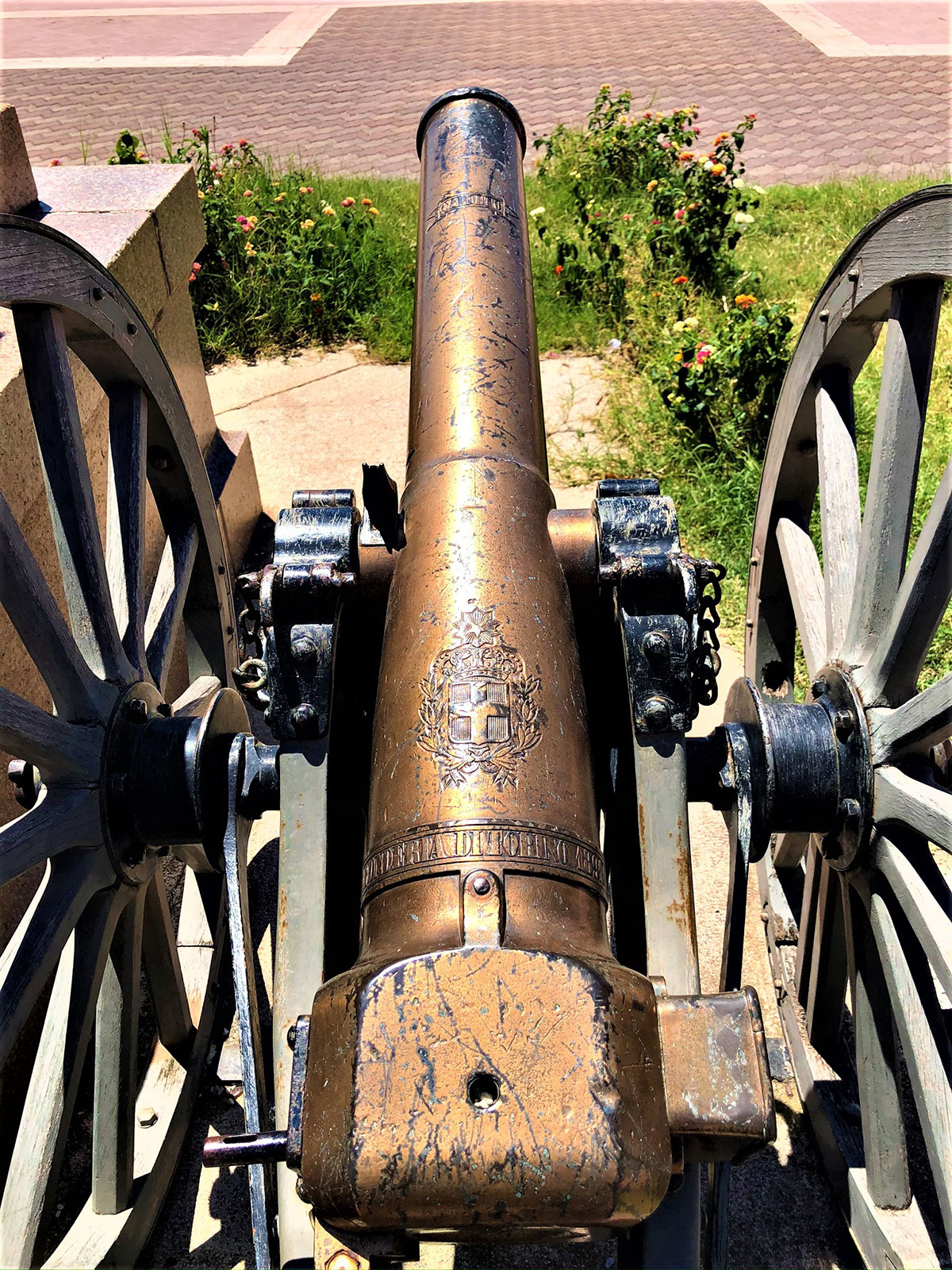 Ubicato in origine nel “Giardino a Mare”, attuale area della Fiera, nel 1935 venne spostato e ubicato nella sede attuale. Il Monumento rappresenta un gruppo di eroici soldati siciliani al comando del veneto Umberto Masotto, protagonisti di uno degli episodi più tragici della guerra d’Africa: la battaglia di Abba Carima nei pressi di Adua dell’1 marzo 1896. Fuso dalla Reale Fonderia di Torino dopo essere stato modellato a Roma nel 1896, i tre militari riprodotti sono grandi una volta e mezza il normale. La base è quadrangolare in marmo di Baveno con targhe in bronzo con i nomi degli ufficiali e dei soldati periti in quella battaglia. Dopo la seconda guerra d’Africa (1935-36), alla base del monumento furono collocati due cannoni riportati in Italia dall’Etiopia, con stampigliato i nomi di Caorso (Comune della Provincia di Piacenza) e Cardeto (Comune della Provincia di Reggio Calabria), rispettivamente fusi a Torino nel 1890 e 1891. In questo bel gruppo monumentale, l’autore riesce a riscattarsi dai limiti della retorica celebrativa, grazie ad una composizione piramidale, di forte impatto plastico-visivo, con tre momenti fondamentali in rapida successione verticale: la vita, la sofferenza, la morte.