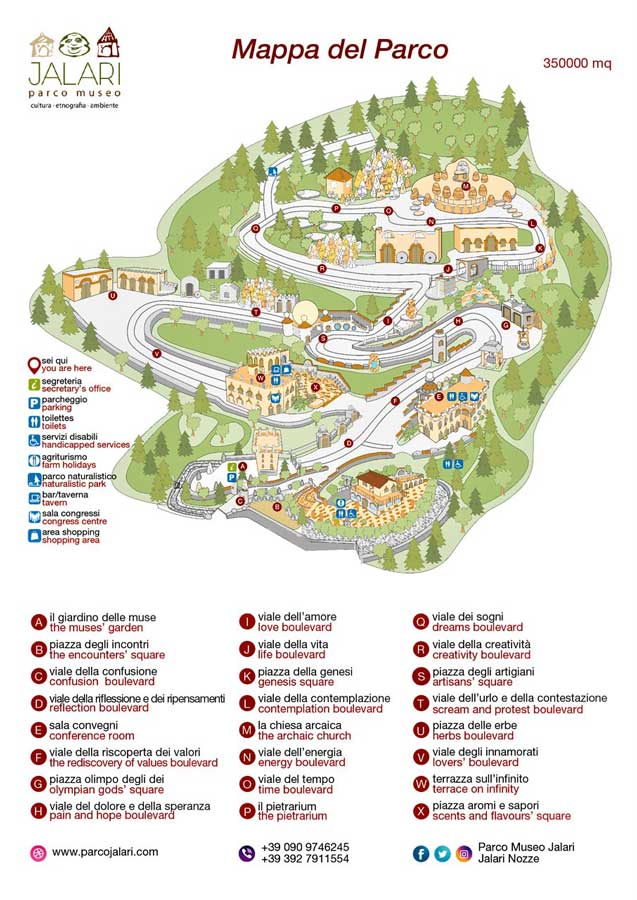 Esteso su una superficie di 350.000 mq., già il nome “Jalari” è tutto un programma perché deriva dalla corruzione del termine al-ḥajar, “la pietra” con il quale gli arabi definivano questa zona dei Peloritani. E di un enorme giardino di pietra, infatti, si tratta. Lungo i viali si incontrano oltre 2000 sculture e fontane in pietra locale, scolpite negli anni dal Prof. Mariano Pietrini che ne ha ideato il pensiero filosofico, mentre il fratello Salvatore Pietrini ha curato gli ambienti, le architetture ispirate alla storia della Sicilia e la lussureggiante vegetazione che ha ridato a questa zona, che in passato era considerata sterile, una nuova vitalità. Un percorso in armonia con l’ambiente circostante, quello del Parco, che dal “Giardino delle Muse” e “Piazza degli Incontri”, conduce attraverso i vari viali fra i quali quelli “della Confusione”, “Riflessione e dei Ripensamenti”, “Riscoperta dei Valori”, “Dolore e della Speranza”, “Amore”, ”Energia”, “Tempo”, “Sogni”, “Creatività”, “Aromi”, alle diverse costruzioni tra favola e sogno che ospitano, tra l’altro, un Centro Congressi, l’agriturismo, il bar-taverna, l’area shopping, le Botteghe degli Antichi Mestieri, il Parco Naturalistico. L’ambiente è l’elemento che domina il Parco e che profuma di erbe aromatiche, che lo caratterizza con gli oltre 40 mila alberi.