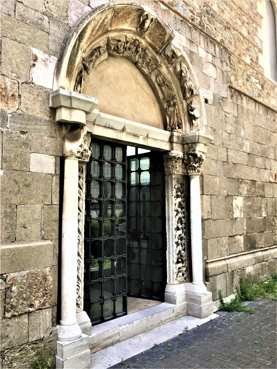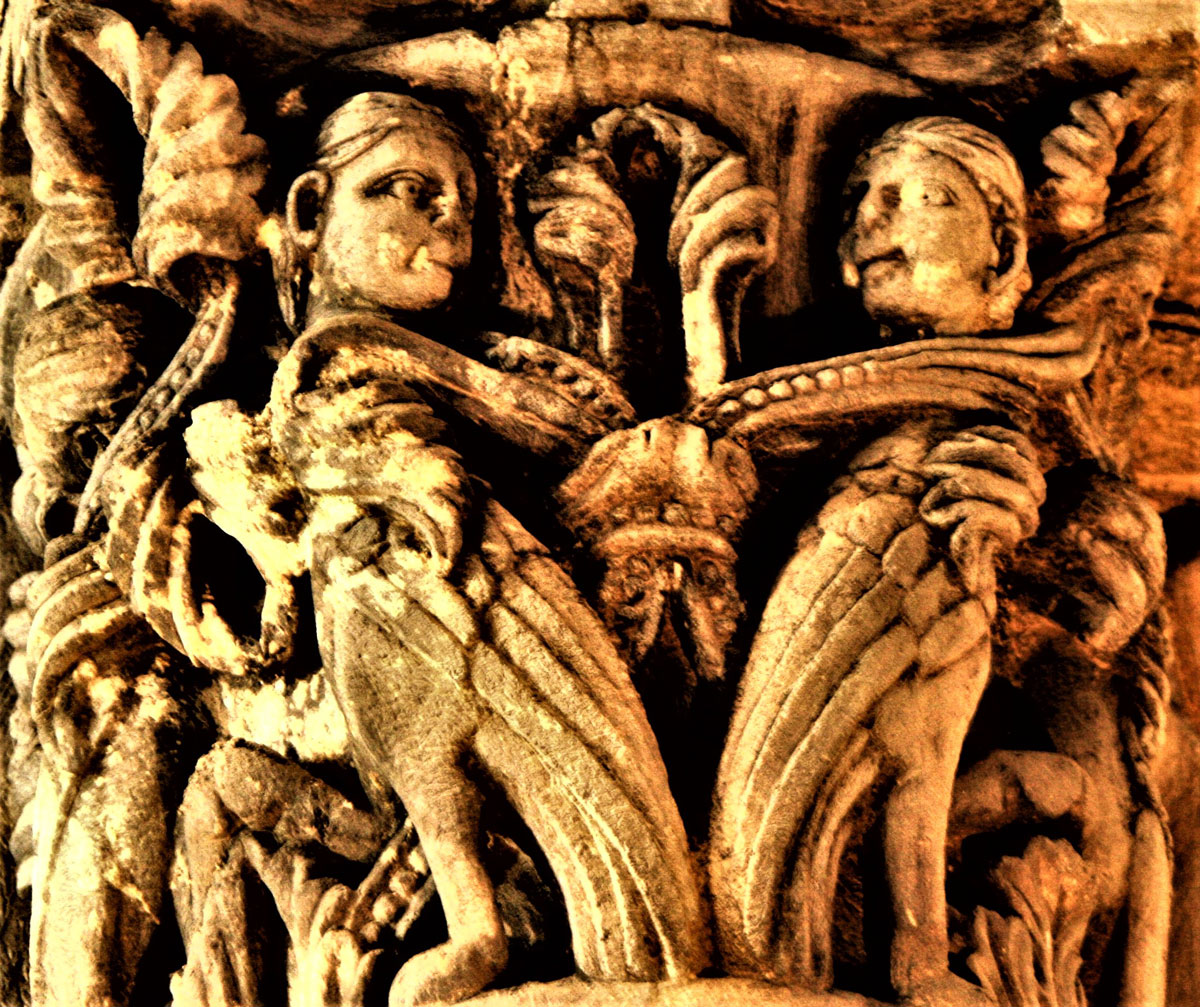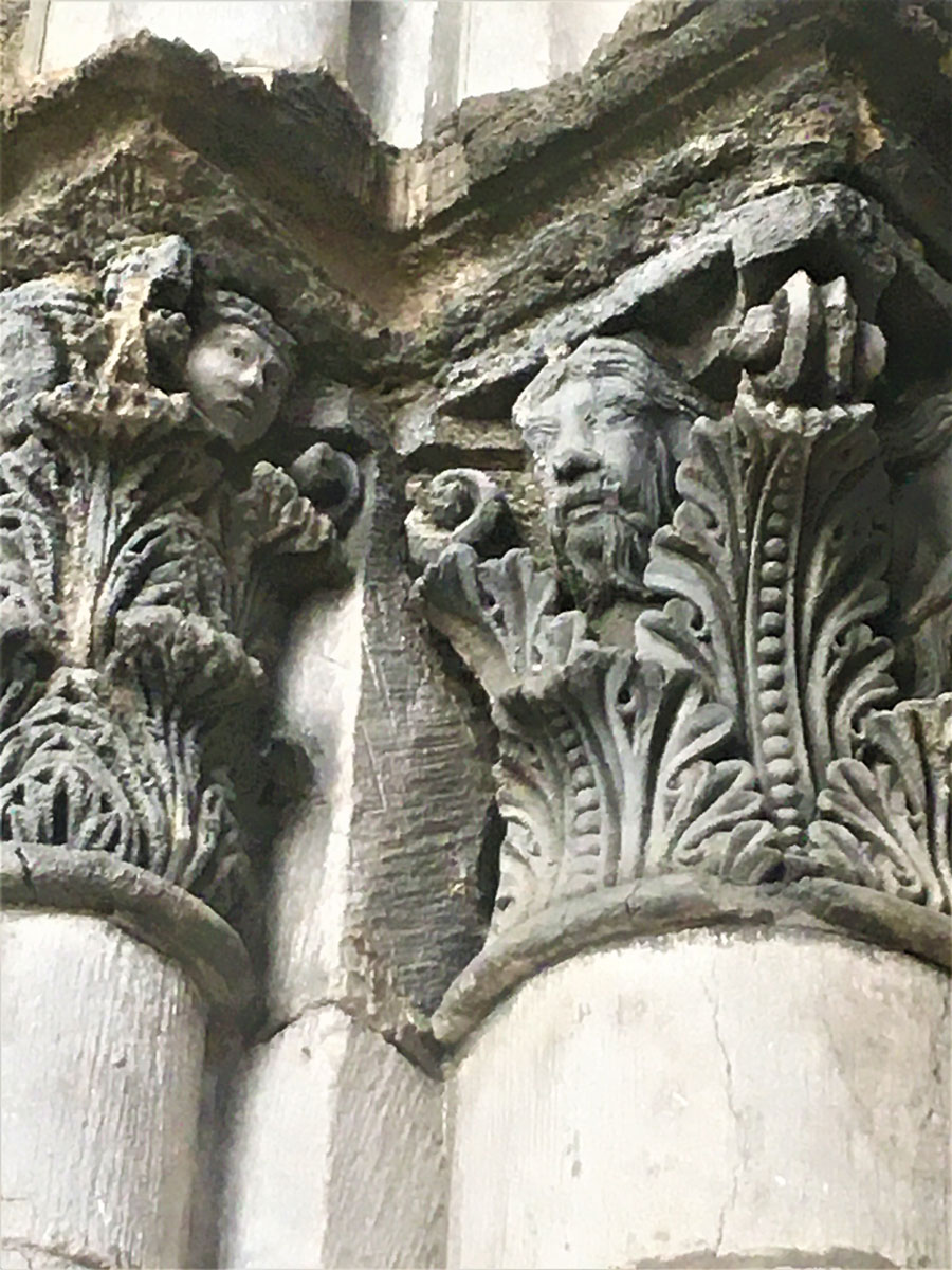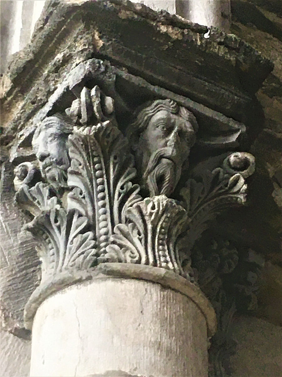 Le teste barbute che si trovano nel capitello a destra del portale laterale, sono in numero di tre a comprendere il Padre, il Figliolo e lo Spirito Santo. Nella simbologia medievale la testa, insieme al cuore, era considerata la parte più importante del corpo, poiché sede della forza vitale, dell’anima e del suo potere. Denotante saggezza, controllo, dominio, per il Cristianesimo è Cristo, la “Testa della Chiesa”.