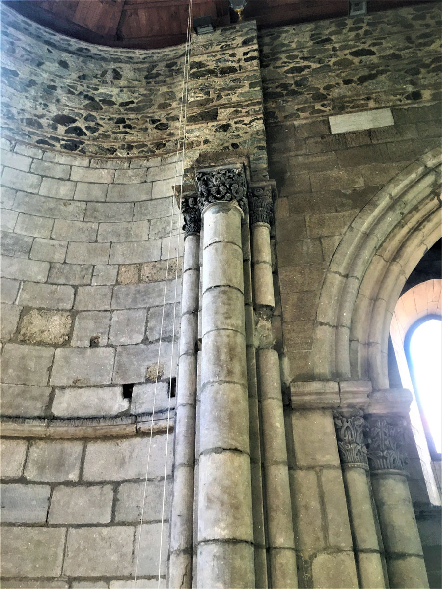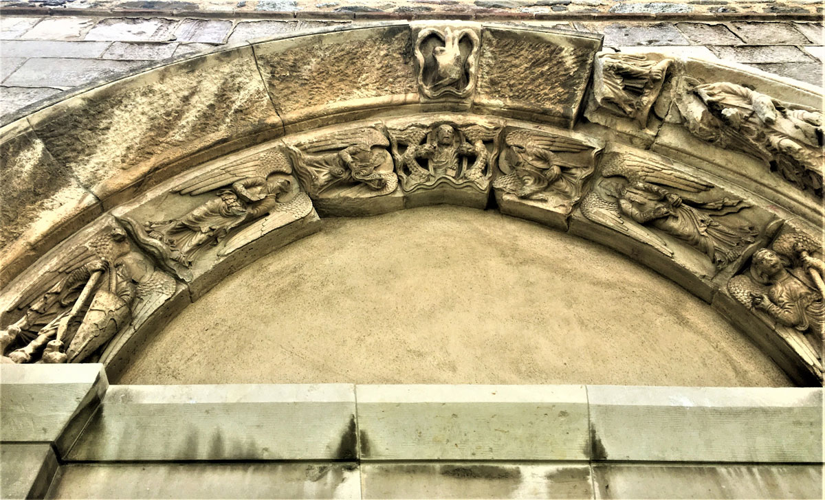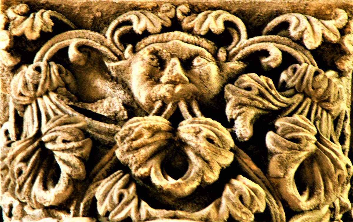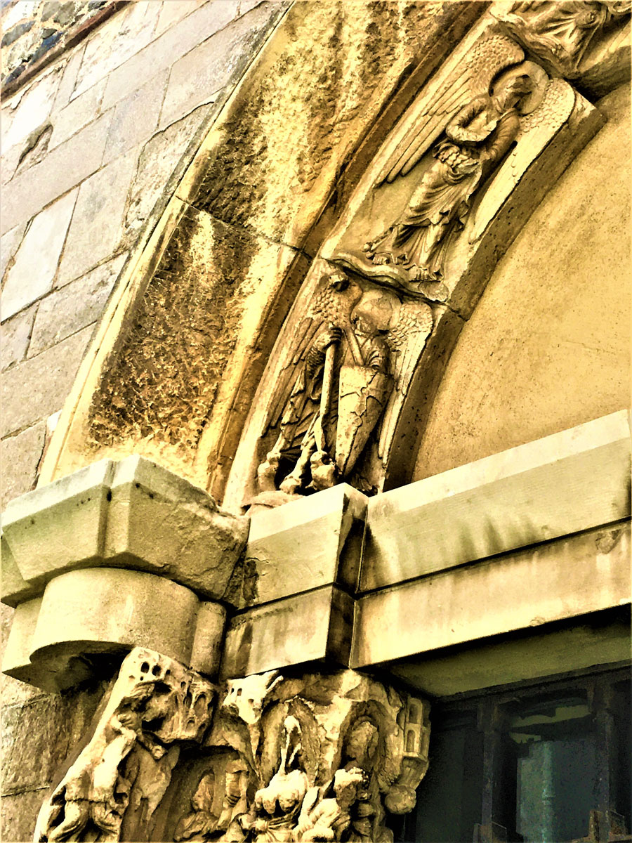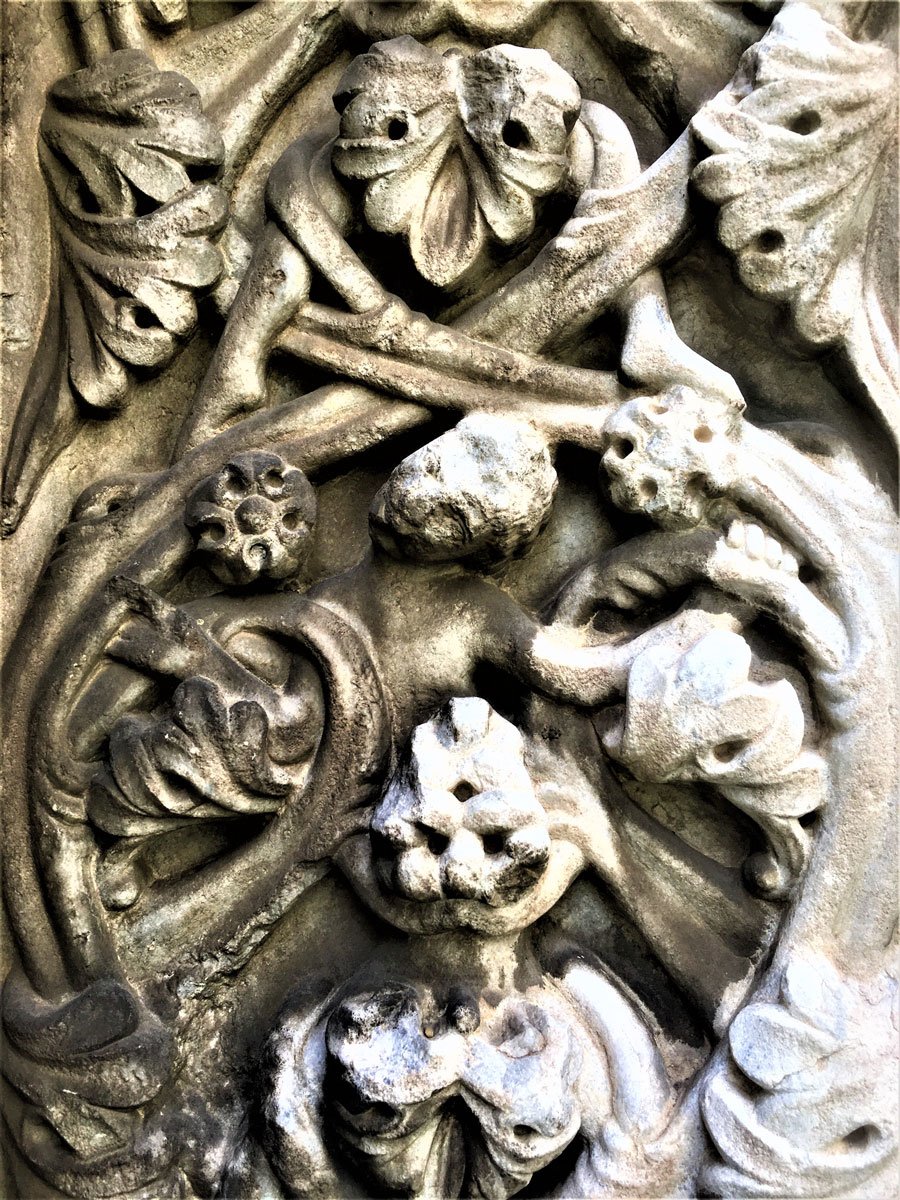 Le teste barbute che si trovano nel capitello a destra del portale laterale, sono in numero di tre a comprendere il Padre, il Figliolo e lo Spirito Santo. Nella simbologia medievale la testa, insieme al cuore, era considerata la parte più importante del corpo, poiché sede della forza vitale, dell’anima e del suo potere. Denotante saggezza, controllo, dominio, per il Cristianesimo è Cristo, la “Testa della Chiesa”.