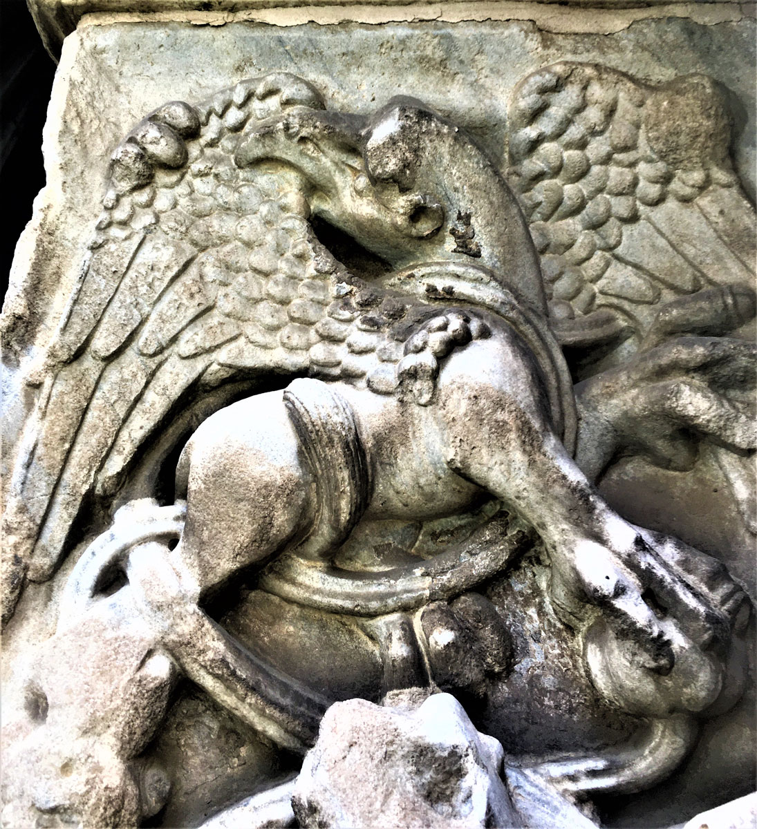 Erano le creature alate mitologiche persecutrici dei colpevoli e, perciò, severe assertrici dell’ordine morale. In quanto terribili e vendicative custodi del bene questi esseri mostruosi con serpenti al posto dei capelli trovano, perciò, collocazione nella Chiesa di Santa Maria degli Alemanni in posizione privilegiata e preminente, nel settore absidale.