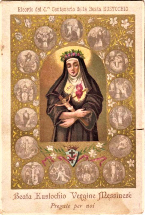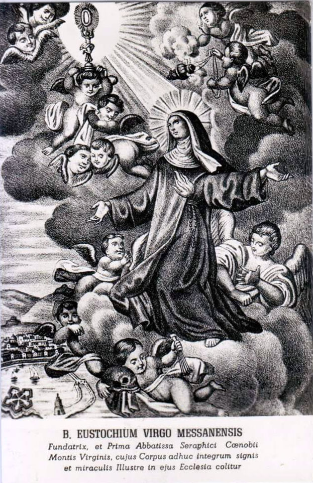 Il 20 gennaio 1485, a mezzogiorno, avveniva il glorioso “transito” della Santa che chiudeva la sua vita terrena trascorsa interamente al servizio di Cristo. Una vita che fu esempio di perfezione nella santa povertà e nella rigida osservanza della Regola di Santa Chiara, continuamente in adorazione di Gesù Eucarestia per molte ore del giorno e della notte. Ancora oggi le massime autorità cittadine civile e religiose, per antico voto del Senato Messinese, il 22 agosto di ogni anno si recano alla Chiesa di Montevergine per assistere alla Santa Messa e rendere omaggio alla Santa. Il Sindaco, in tale circostanza, offre in nome della città un cero del peso di 38 libbre, artisticamente lavorato. A tale particolare cerimonia è legato il voto espresso a Santa Eustochia in occasione di uno dei suoi interventi miracolosi. Era il 1615 e il terremoto imperversava a Messina con frequenti scosse, al punto tale che i messinesi a Lei si rivolsero pregandola di intercedere in favore della città. Le Clarisse tolsero il Corpo incorrotto dall’oratorio dov’era custodito e lo intronizzarono nel coro. Mentre stavano iniziando le preghiere del vespro, il volto si contrasse, le labbra si schiusero e intonarono il Gloria Patri: da quel momento le scosse ebbero termine.