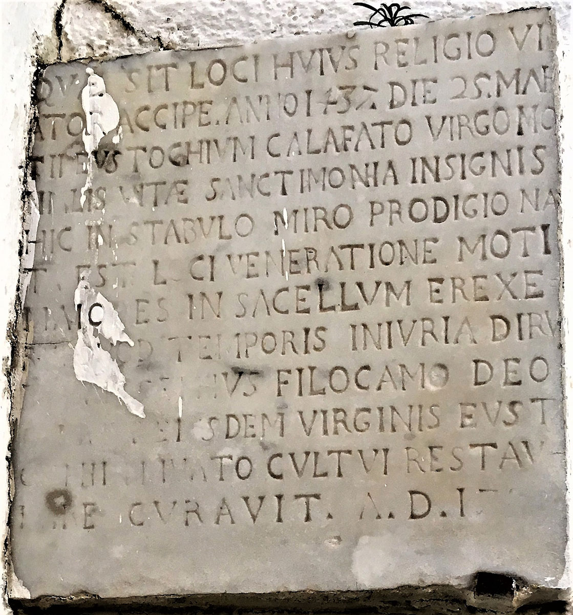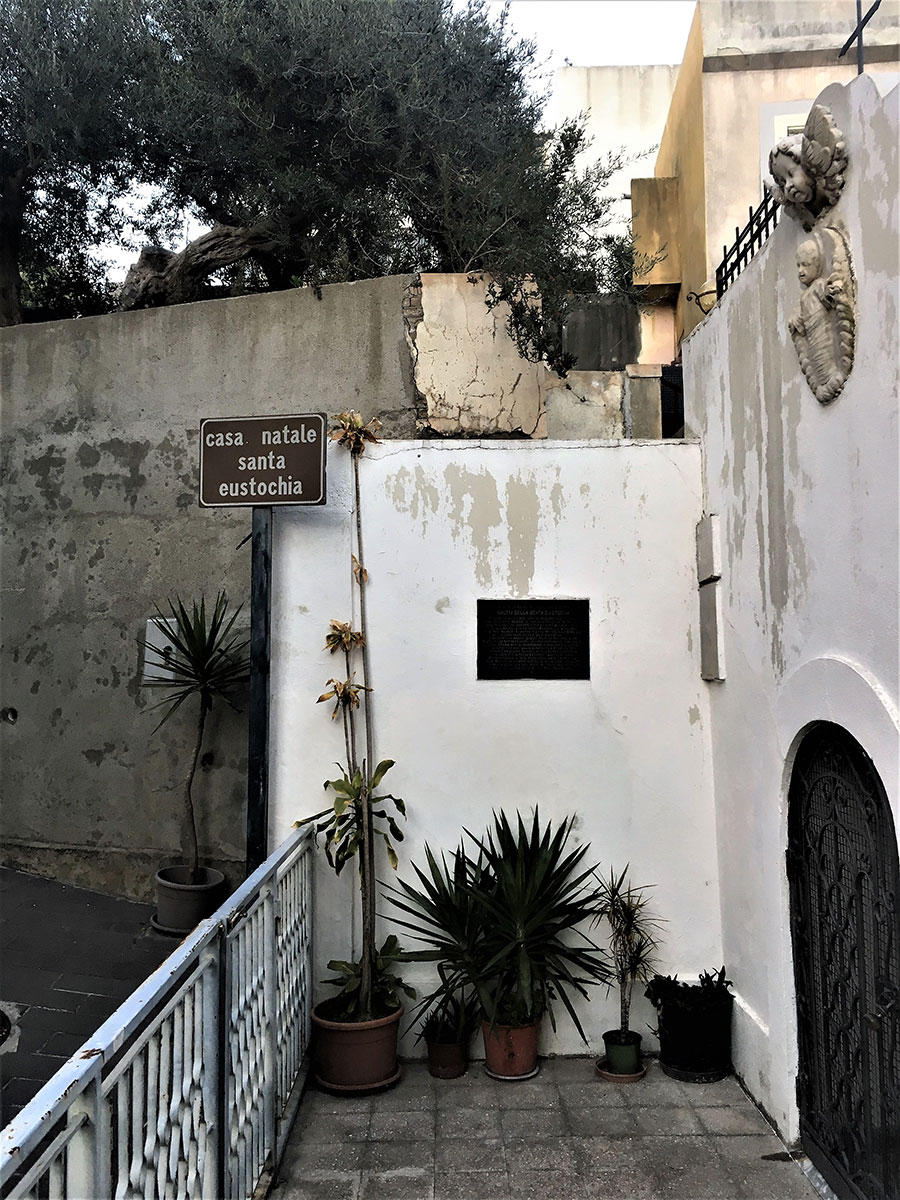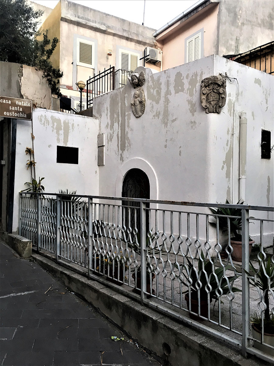 Santa Smeralda Eustochia Calafato, figlia del ricco mercante Bernardo e di Mascalda Maya Romano Colonna, nacque nel Casale SS. Annunziata in una “Stalla” che ancora si conserva trasformata in tempietto, in un vicoletto di Contrada “Caprera”. La prodigiosa nascita, avvenuta il 25 marzo 1434, fu così descritta da Placido Samperi nell’“Iconologia” del 1644: “Si attaccò in questo mentre la peste nella Città di Messina; & i Signori per tema del contagio nelle loro Ville si ritiravano, come anche fece Bernardo, che con la Famiglia sen’andò nel suo podere, ch’era in un Villaggio, detto dell’Annuntiata […] Quivi dimorando Maya s’appressò l’hora del desiato parto, nel quale sentendo gravissima difficoltà, un certo viandante fermatosi alle strida della parturiente, disse, mosso forse da Spirito di Dio, per quello, che mostrò la riuscita, conducete questa Signora nella stalla, perché altrove non potrà partorire. Obbedì, & inviossi colà, ove subito partorì un’avventurosa pargoletta di bellezza estrema […] à 25 di Marzo, quando la Beata Vergine concepì nell’utero suo l’Eterno Verbo […] la religiosa Madre sopramodo si rallegrava, per lo voto fatto di dedicare alla Santissima Vergine nel Monasterio la nata fanciulla; la quale battezzata, fù chiamata nel Fonte Smeralda […]”.