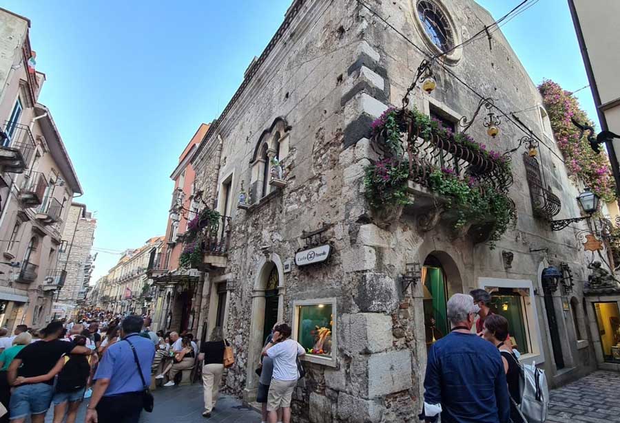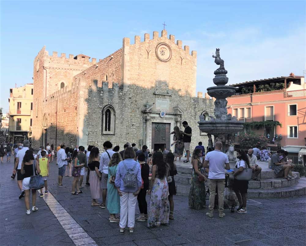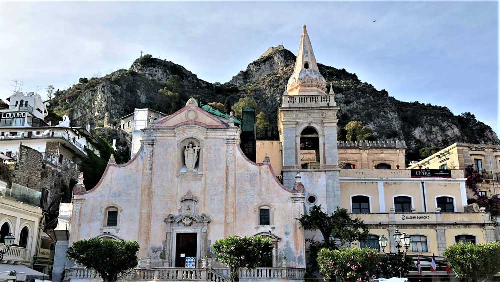 Oltre alle importanti testimonianze archeologiche di Taormina-Tauromenion, la città conserva chiese e palazzi che vanno dal Medio Evo al sec. XVIII. L’immagine della sua architettura medievale trova la sua naturale definizione nell’operato di un artigianato locale che pone la propria attività con inizio durante il periodo arabo con la ricostruzione di “Almoezia” (Taormina venne così chiamata in omaggio al Califfo Al Moezz dopo la sua definitiva espugnazione, nel 962, per mano di Hassam Ibn Hammar), proseguita dopo il 1079 con i normanni e sviluppata in epoca aragonese con la massima espressione artistica. Sarà comunque la cultura figurativa araba che si troverà sempre presente nella produzione architettonica taorminese fino al XV secolo. Il 9 agosto 1943 Taormina venne bombardata dagli aerei alleati, bombardamenti che si protrassero per 2 giorni. A restaurare i monumenti gravemente danneggiati venne incaricato l’architetto napoletano Armando Dillon.