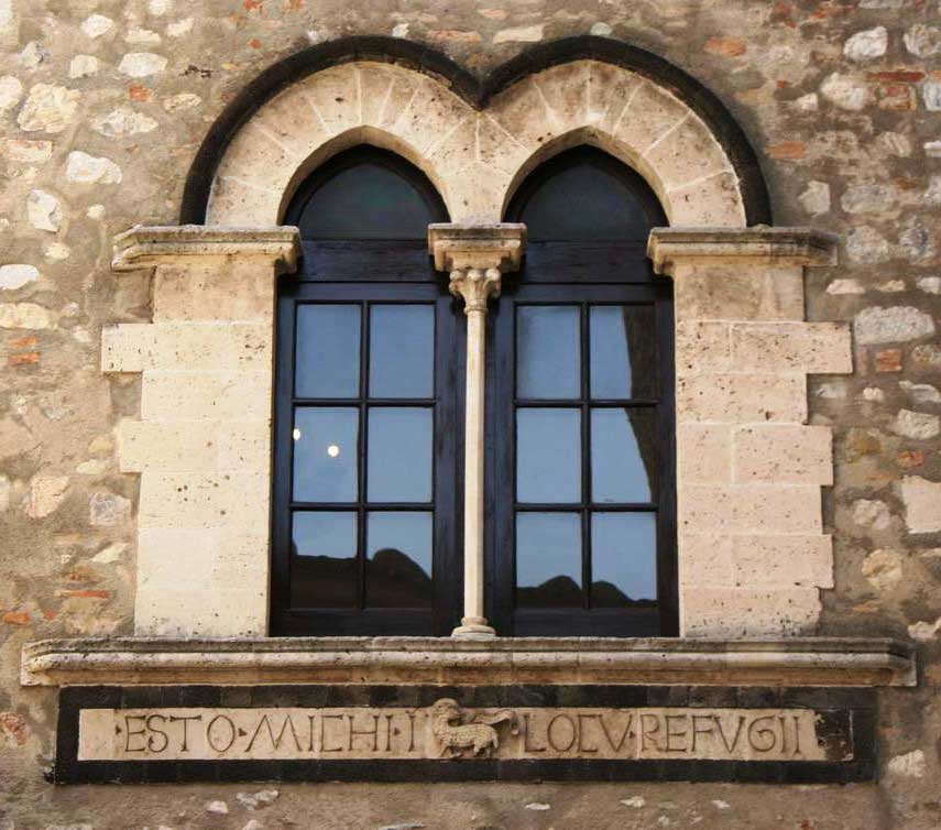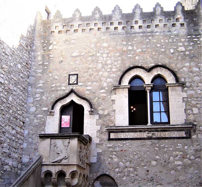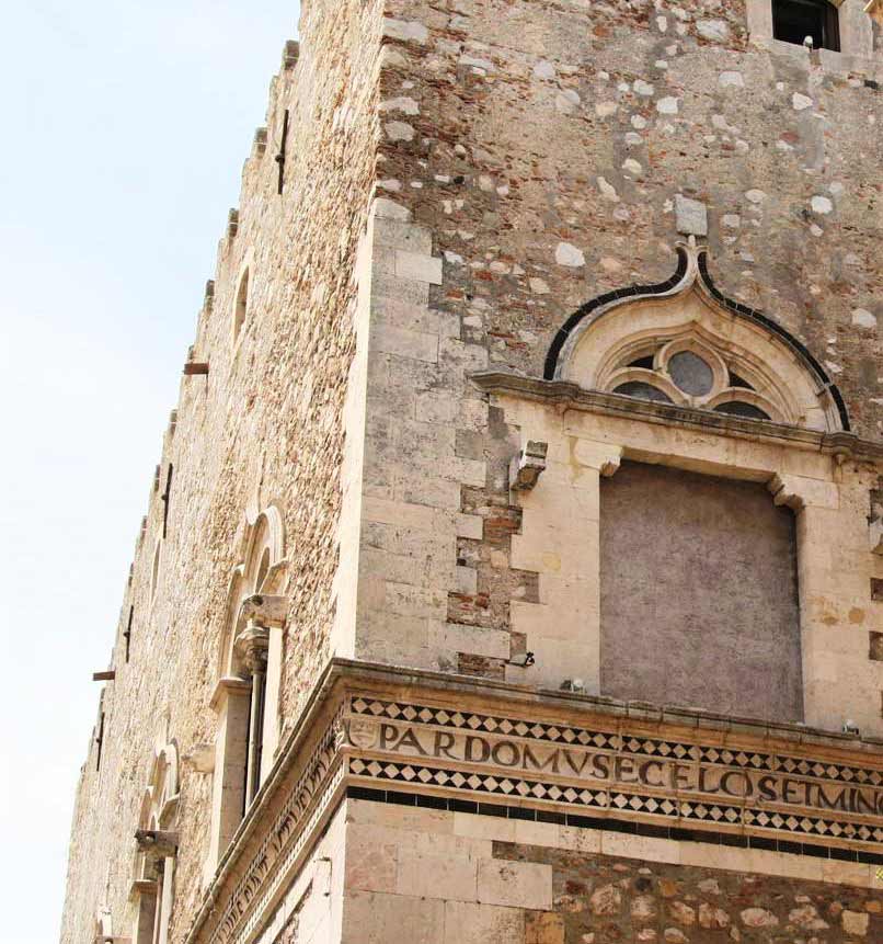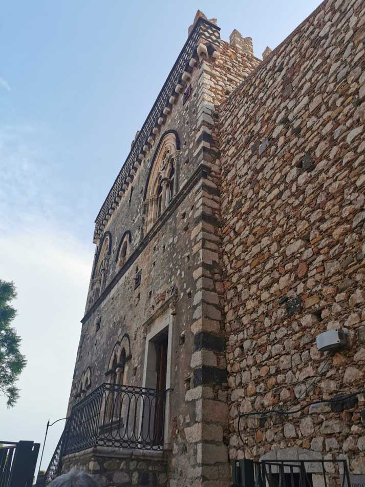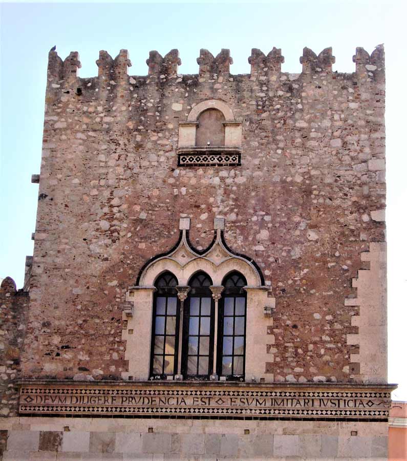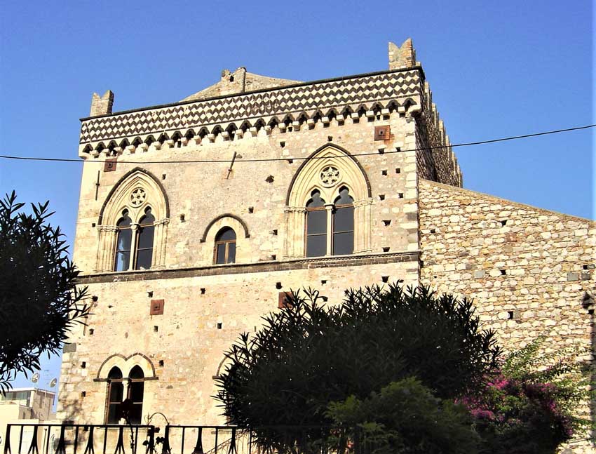 Per la sua posizione (oggi sulla strada provinciale 10, nella parte alta di Taormina), la cosiddetta “Badia Vecchia” faceva parte del sistema difensivo della città: nel suo aspetto, infatti, è più accentuato il carattere di torrione. La prima impostazione potrebbe essere araba mentre il rifacimento, per adattare gli ambienti a signorile dimora, sarebbe stato eseguito nel secolo XIV con l’inserimento di motivi dell’architettura tardo-gotica. Probabilmente servì come dimora delle due principesse aragonesi Costanza ed Eufemia, monache e badesse, che intorno al 1350 tennero le redini del governo in nome dei minori congiunti. Le tarsie bicrome (bianche e nere) nel Palazzo Duca di Santo Stefano e nella “Badia Vecchia”, appartengono già al repertorio dei motivi orientali adottati in età normanna, come nella Chiesa SS. Annunziata dei Catalani a Messina.