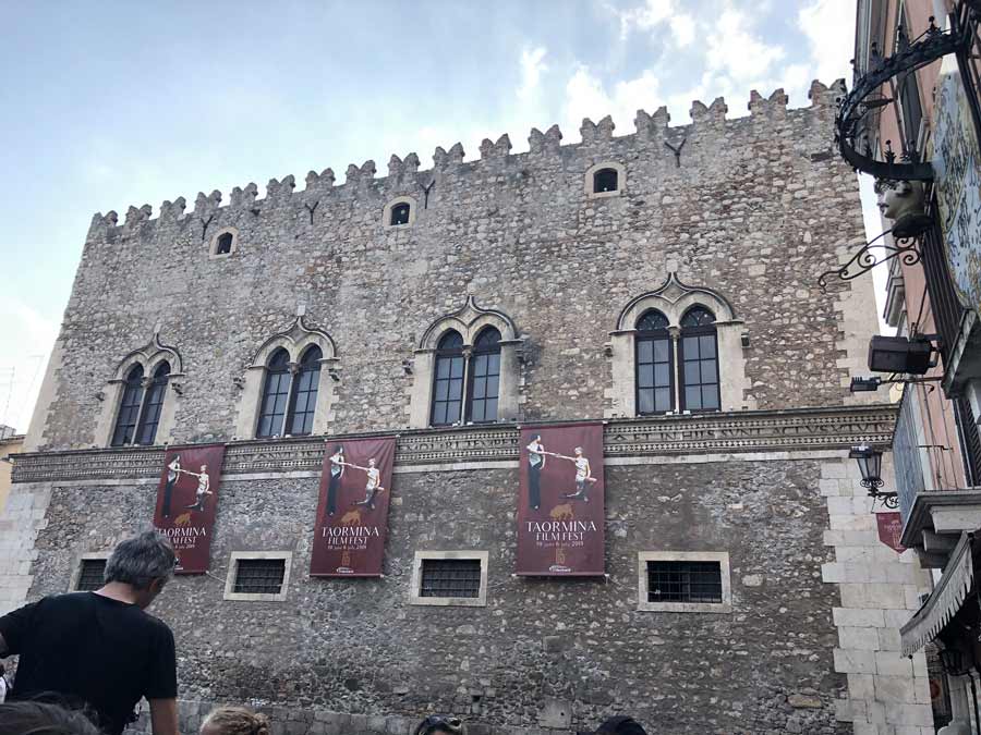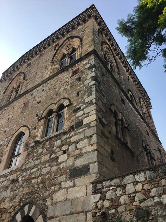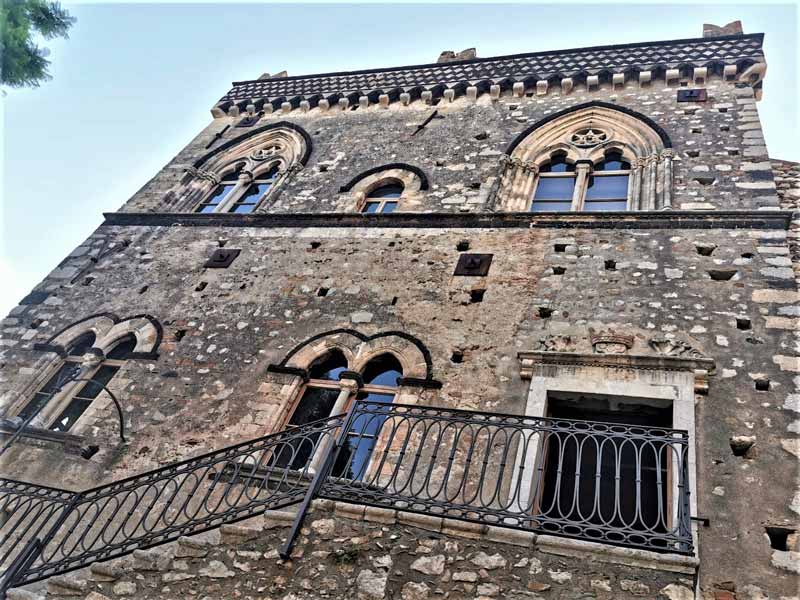 Simile a un torrione, è a tre elevazioni fuori terra e appartenne alla famiglia dei De Spucches, Principi di Galati e Duchi di Santo Stefano (Casale, quest’ultimo, nel Comune di Messina). Nel complesso della costruzione, risalente al 1412, furono adottati materiali di diversa natura: i grossi blocchi sono di marmo locale bianco, grigio, rosso; il basalto scuro proveniva da Calatabiano e da Schisò; la pietra pomice veniva importata da Piedimonte Etneo e da Linguaglossa; l’arenaria verde dalle spiagge di Letojanni. Il pianterreno conserva integre le sue strutture di copertura a volta. Nei tre piani, si sviluppano altrettanti ambienti: un solo salone, di circa 100 metri quadri, per ciascun piano. Nella parte basamentale e negli spigoli sono impiegati grossi blocchi di pietra che sono da ritenere, per il modo stesso con cui sono messi in opera, provenienti da monumenti archeologici. Il palazzo è stato acquisito dal Comune di Taormina nel 1964 e destinato a sede della Fondazione Mazzullo (Giuseppe Mazzullo, scultore, Graniti, 15 febbraio 1913 – Taormina, 25 agosto 1988).