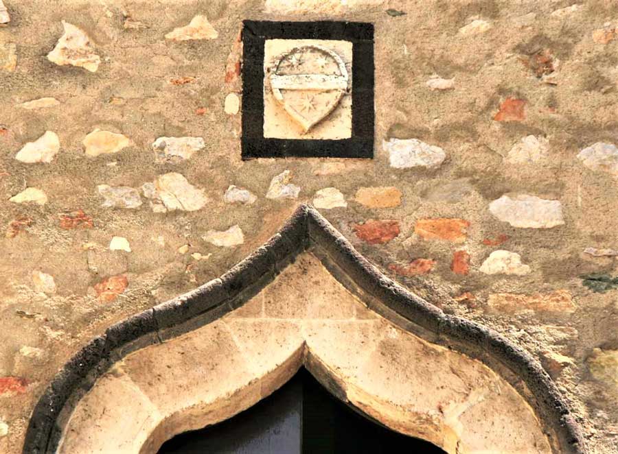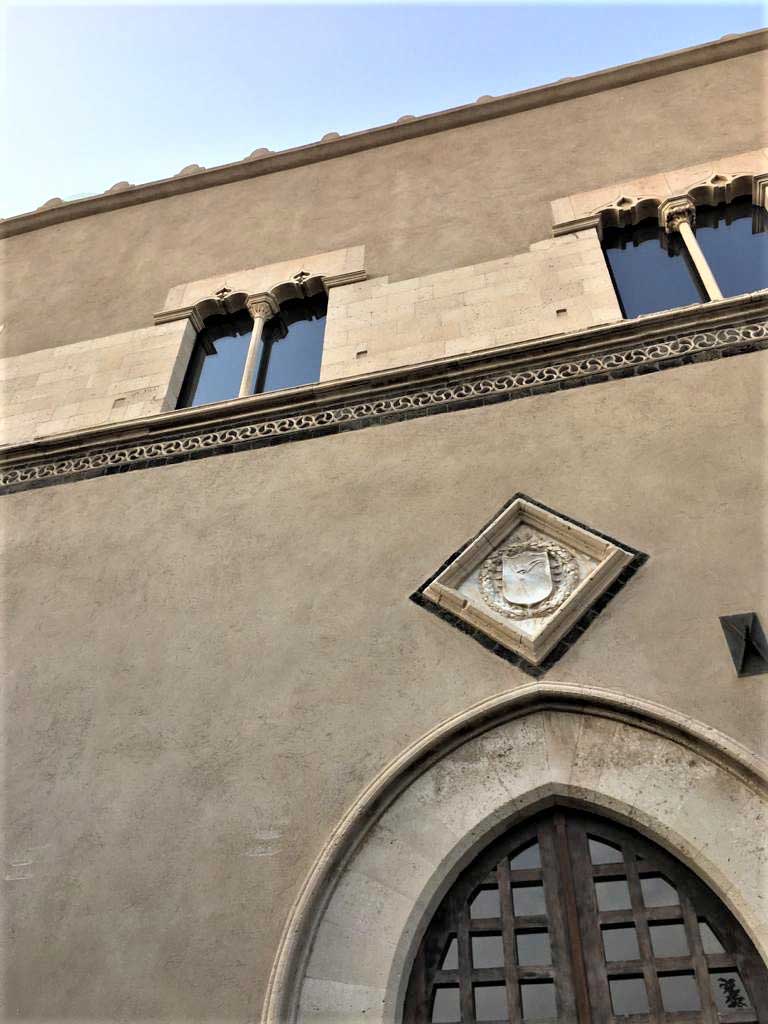 Nella superficie nitidamente disegnata di Palazzo Ciampoli, pochissimi elementi aggettanti ne definiscono l’architettura: essi sono la gola di coronamento che collega i merli, la cornice continua dei davanzali delle cinque finestre bifore che divide i due piani, la ghiera del portale, la targa romboide posta al vertice del portale stesso a segnare l’asse e ad accentuarne la verticalità. Lo stemma racchiuso nel rombo porta la data del 1412 e un vessillo spiegato attribuito a Damiano Rosso, Alfiere Maggiore del Regno e frate domenicano. Il Portale aperto nel tratto superstite del muro di cinta, è eseguito secondo lo schema architettonico comunemente adottato, verso la metà del sec. XV, nell’Italia meridionale e perciò definito durazzesco, come quello che immette nella Chiesa della Triade a Forza D’Agrò. Le teste virili in bassorilievo sono di epoca tardo-romana.