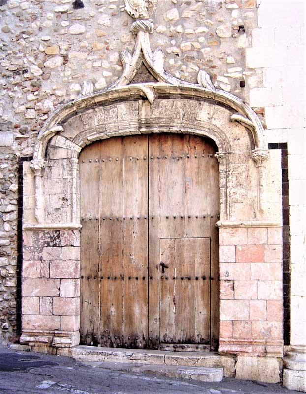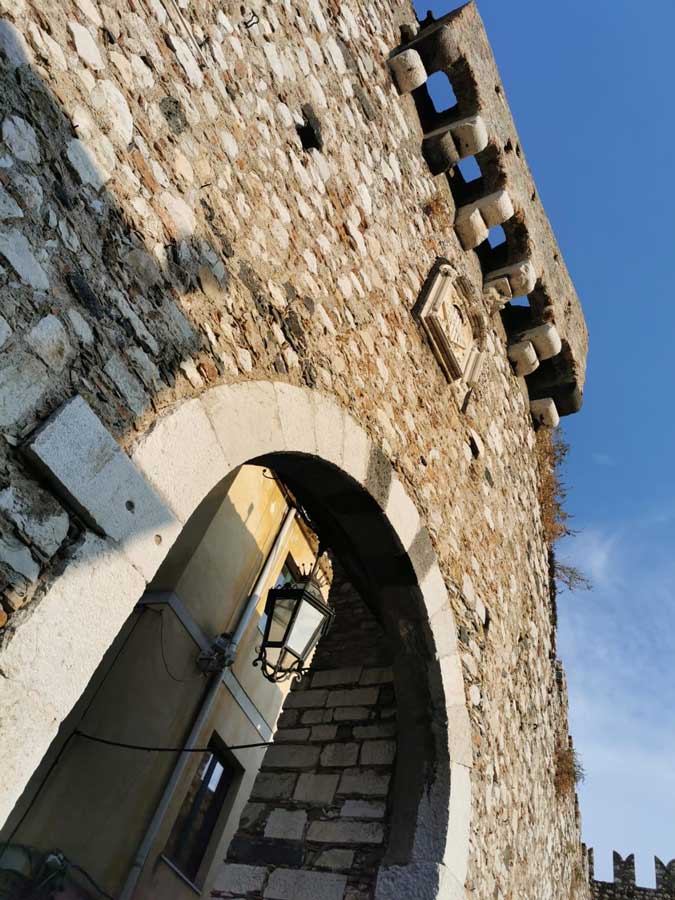 In origine “Porta del Tocco”, già restaurata in epoca aragonese quando venne pure inserita la raffinata edicola con arco inflesso e gotiche colonnine con lo stemma romboidale degli Aragona di Sicilia, la città turrita e la data MCCCXXXX (1340). Incorporata nella cortina muraria fortificata medievale in blocchi squadrati di pietra calcarea con arco a tutto sesto leggermente depresso, la porta conserva in sommità un “cascatoio” o “piombatojo” su mensoloni, dotato di strette feritoie per gli arcieri.