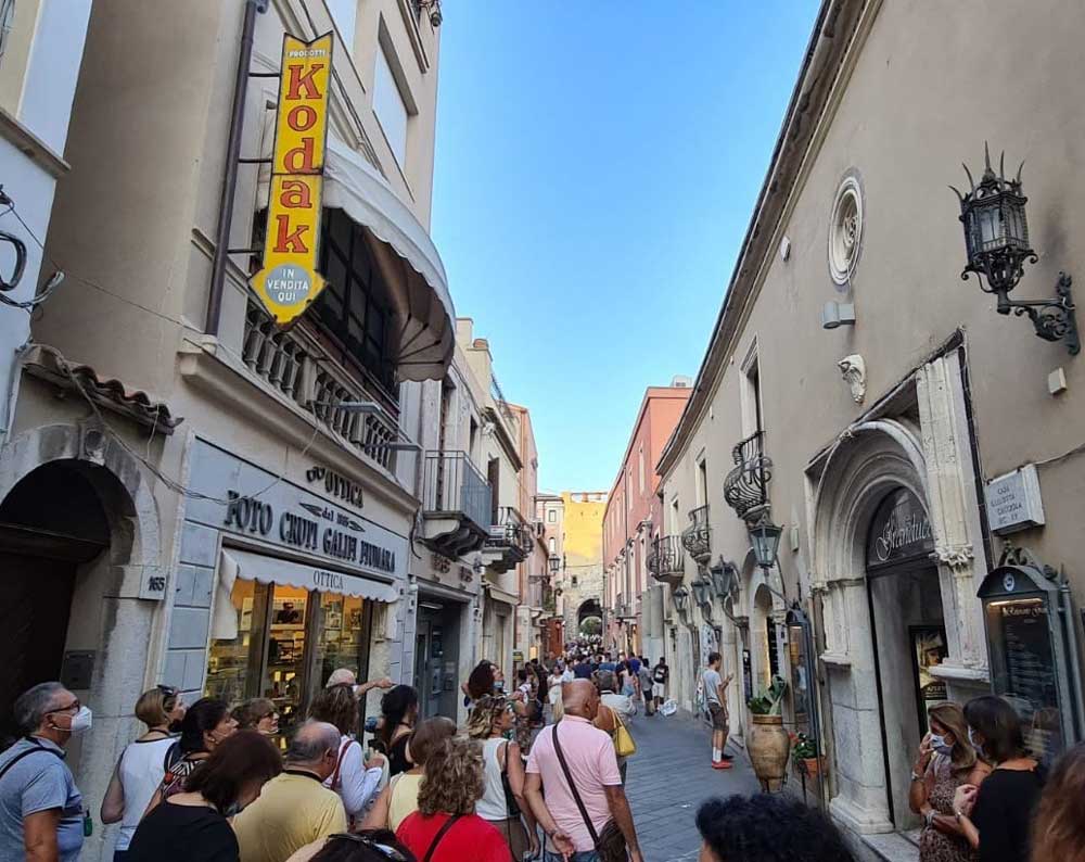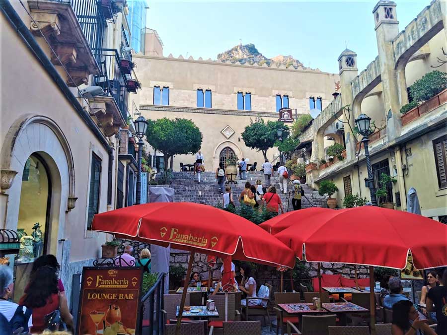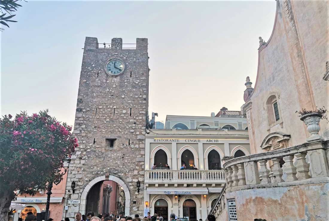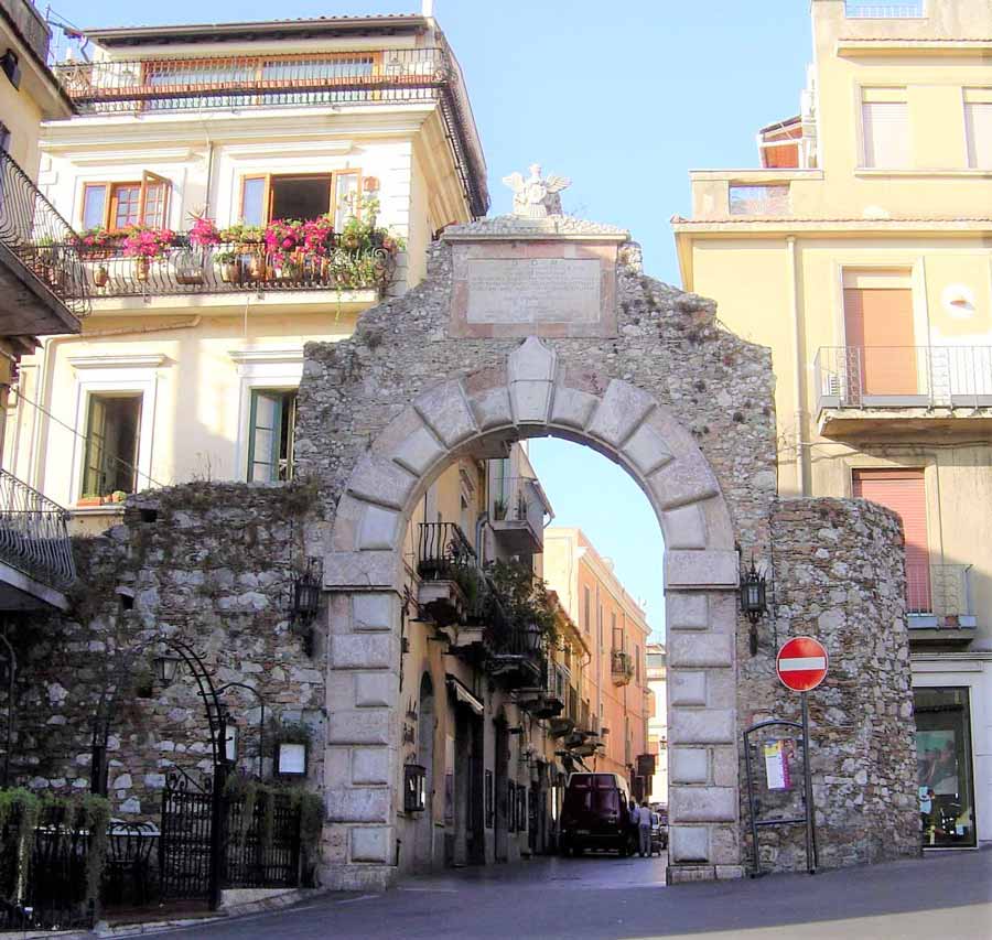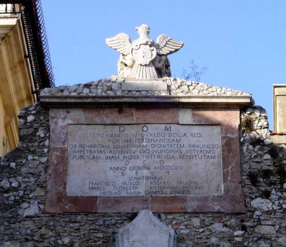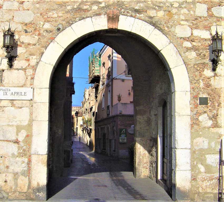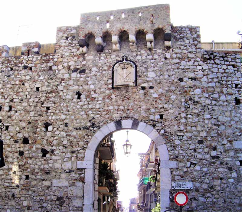 Insieme alla Porta Catania, le due porte d’ingresso a Taormina facevano parte del triplice sistema di fortificazioni che si sviluppava da nord-est, realizzato dagli arabi per difendere la città. Tra le due porte si innalza la Porta di Mezzo nota anche come Torre dell’orologio. Fu inaugurata nel 1808 da Ferdinando IV di Borbone (come riportato nella lapide in cima alla Porta) ed è conosciuta anche come Porta Ferdinandea proprio in onore al re.