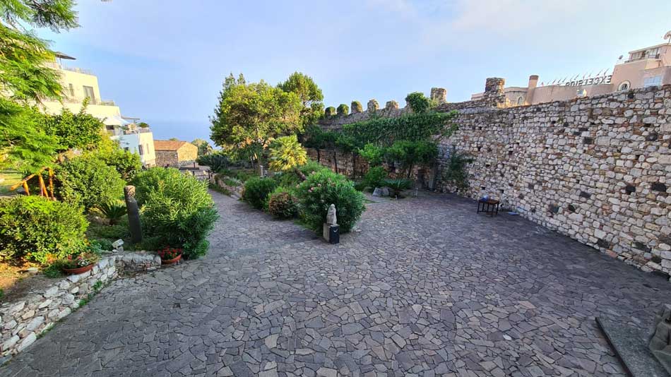 Nella salita del Carmine, una scalinata che ha inizio da piazza Duomo e si conclude con la seicentesca ex Chiesa del Carmine, in adiacenza si conserva un brano di pavimentazione esterna del peristilio (di cui si vedono ancora i blocchi di pietra del basamento) di un’abitazione privata risalente al II secolo a.C. Si tratta di una decorazione a mosaico di tipologia ellenistica con ciottoli policromi gialli, rosa, neri e grigi, assemblati a tessere poligonali di più grandi dimensioni. Al centro spicca un motivo geometrico a doppio quadrato con fiore stilizzato centrale e delfini guizzanti agli angoli.