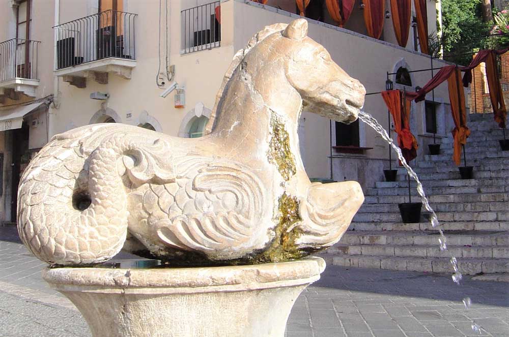 Ispirata alla Fontana Orione di Giovan Angelo Montorsoli nella piazza Duomo di Messina, fu realizzata nel 1635. Sull'orlo esterno della seconda vasca in alto sono scolpiti i nomi dei giurati che ne ordinarono la realizzazione: Vincenzo Cacopardo - Cesare Cipolla - Vincenzo Spuches - Geronimo Mena. In sommità si trova una centauressa bipede incoronata (figura mitica metà toro e metà donna, emblema di Taormina-Tauromenion) che regge una sfera e uno scettro, simboli del potere e del comando.