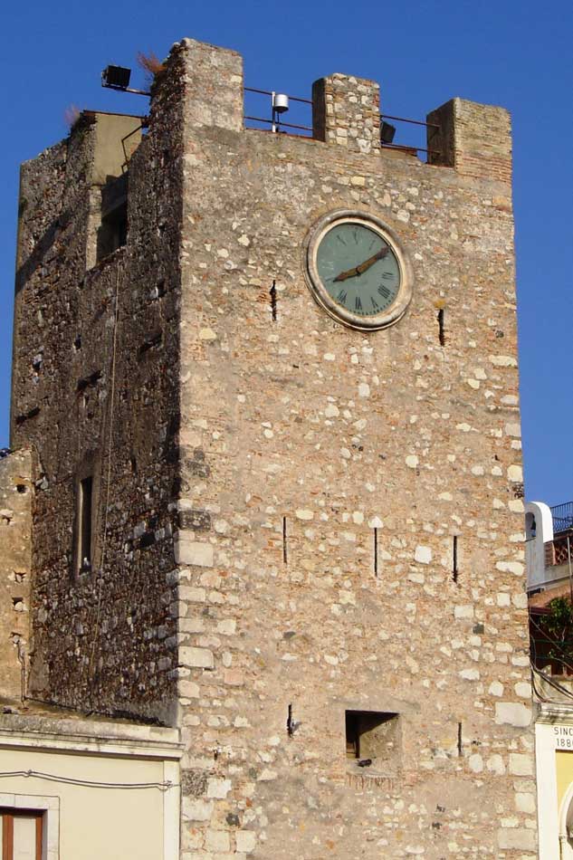 Con la terza cinta muraria fortificata, la Torre delimitava quella vasta porzione urbana che costituiva il “borgo quattrocentesco”. Venne edificata verso il secolo XII su un preesistente basamento di antica costruzione difensiva risalente al IV secolo a.C. circa. Nel corso della rivolta antispagnola del 1674-78 fu rasa al suolo nel 1676 e ricostruita tre anni dopo. La presenza dell’orologio ha fatto sì che sia usualmente identificata come “Torre dell'Orologio” e non più “Torre di Mezzo” che era il suo originario toponimo in quanto separava il borgo medievale dalla parte classica ed ellenistica. All’intero della Porta di attraversamento è collocata su una parete la riproduzione del mosaico bizantino della “Madonna della Ciambretta” conservato nel Museo Regionale di Messina, murata su una parete.