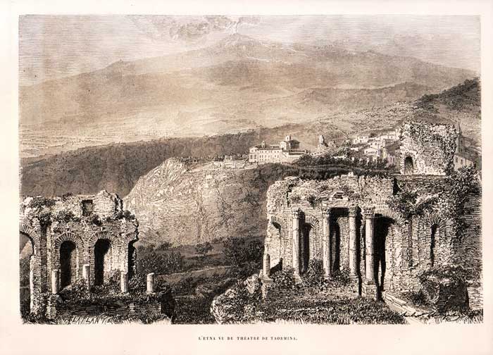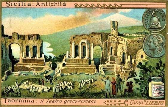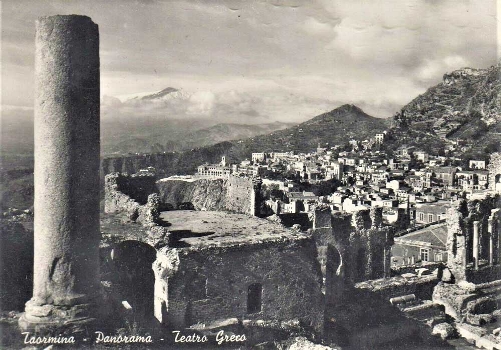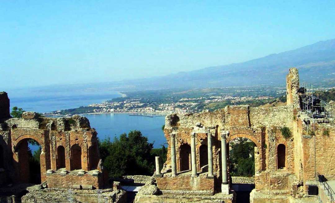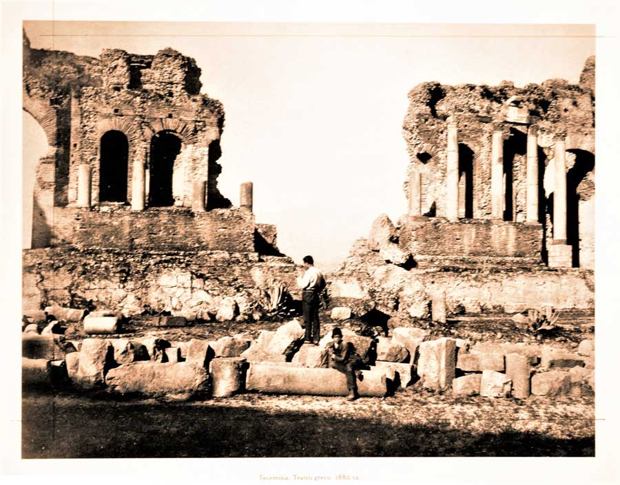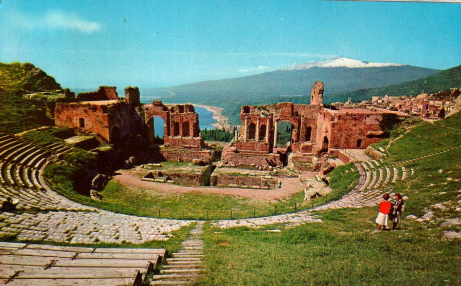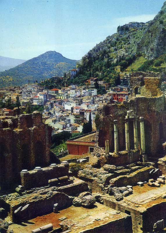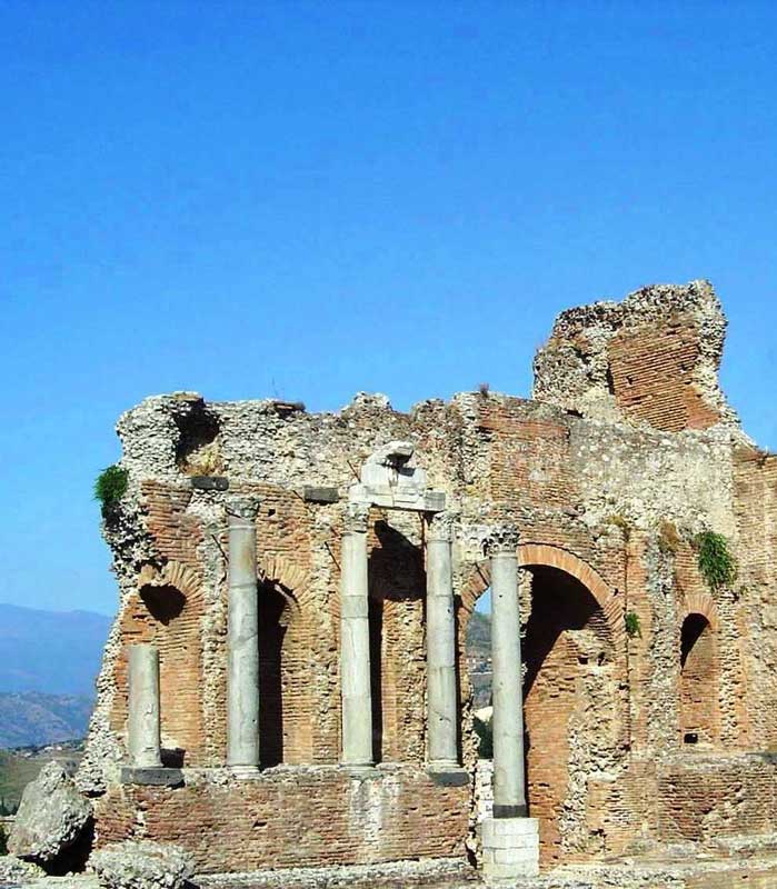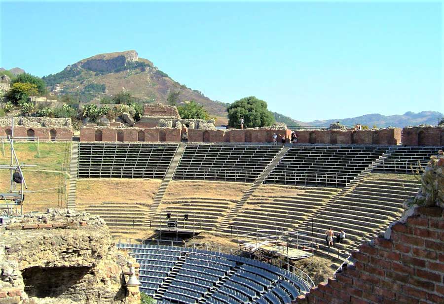 Il Teatro che sorge sul Monte Croce, una delle acròpoli di Tauromenion, venne eretto in epoca ellenistica (III sec. a.C.) durante il governo di Gerone II, come testimoniano alcune iscrizioni greche sui sedili, molto simili a quelle coeve nel teatro di Siracusa. Fu quasi completamente rifatto alla fine del I sec. d.C. in età repubblicana o del primo Impero ed ampliato nella prima metà del II sec. d.C. In sostanza esso compendia le due maniere costruttive greca e romana: è greca la maniera di ricavare la cavea scavandola nella roccia stessa mentre i romani costruivano i loro teatri fuori terra; è romana quella di concepire l’imponente e sfarzosa scena, come romane sono tutte le strutture. Abbandonato dopo l’assedio dei Vandali, durante il Medio Evo la struttura della scena e le due torri scalarie furono riutilizzate per la costruzione di un palazzo. Nell’Antiquarium annesso sono conservati alcuni reperti, fra i quali, un torso acefalo di Apollo o Dionisio del periodo ellenistico; un sarcofago romano a sagoma di bambino con rappresentazione bacchica; due epigrafi votive, una relativa ad Iside e Serapide (ritrovata nella Chiesa di S. Pancrazio) e l’altra riferita al culto di Demetra e Kore.