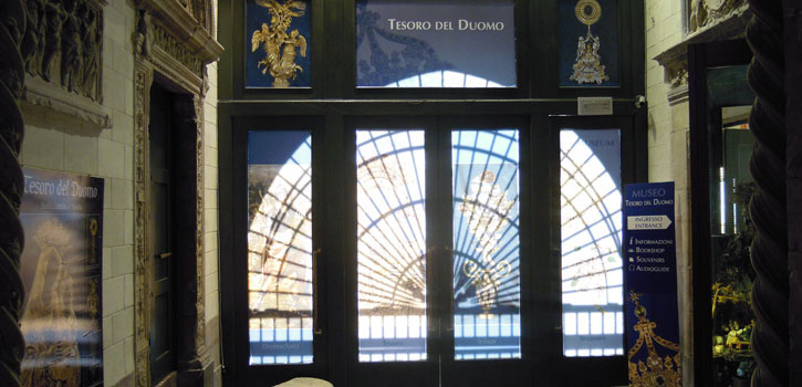 Realizzato in occasione del Giubileo del 2000, il Tesoro del Duomo custodisce una preziosissima e rara collezione di circa quattrocento opere di oreficeria e argenteria prodotte da orafi e argentieri messinesi dal X al XX secolo, a testimonianza di quanto Messina fosse importante centro di produzione in questo settore, conosciuto e apprezzato in tutto il mondo. Nella città, al 1393 risale il primo marchio, che sarà mantenuto nel corso dei secoli, lo scudo crociato sormontato da corona con ai lati le iniziali M.S. (Messina Senato). Tale attività era talmente diffusa e radicata a Messina che un’intera strada detta “degli Argentieri” (ancora oggi esistente) era loro dedicata per esservi la concentrazione di botteghe e laboratori. Si pensi, a tal proposito, che nel ‘600 erano trecento e le loro creazioni d’arte costituiscono un patrimonio immenso, sparso in tutto il mondo, con una grande concentrazione appunto nel Tesoro della Cattedrale dov’è custodita, anche, l’eccezionale “Manta” d’oro della Madonna della Lettera. Al Museo si accede dall’interno del Duomo Basilica Cattedrale e nell’atrio si può ammirare un monumentale Presepe napoletano del sec. XVIII. Il percorso si articola in quattro sale disposte su due livelli.