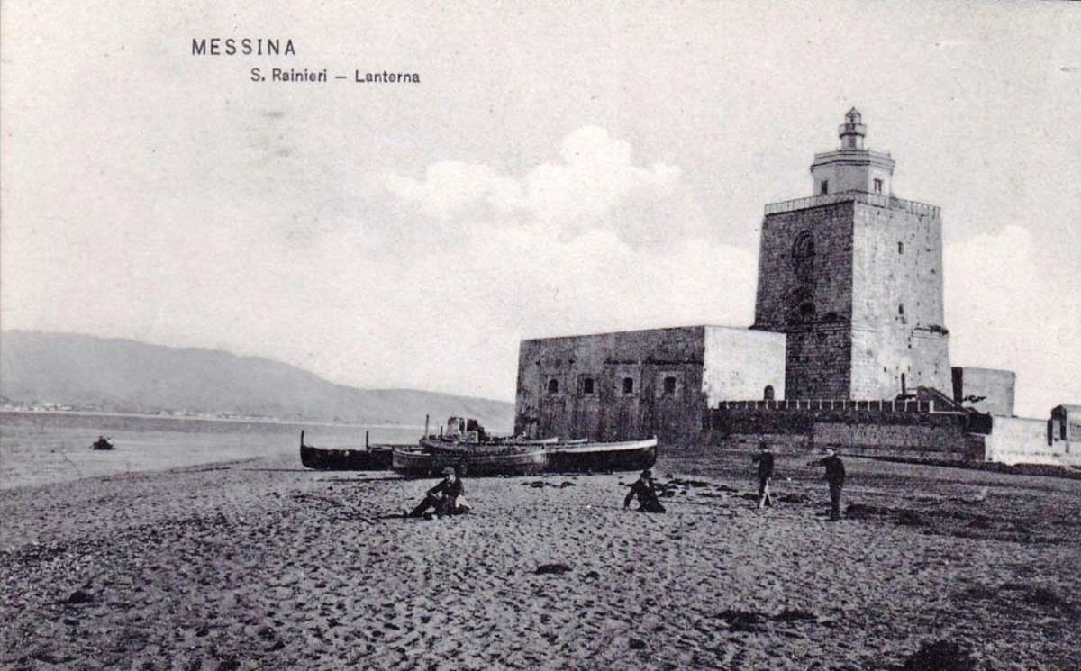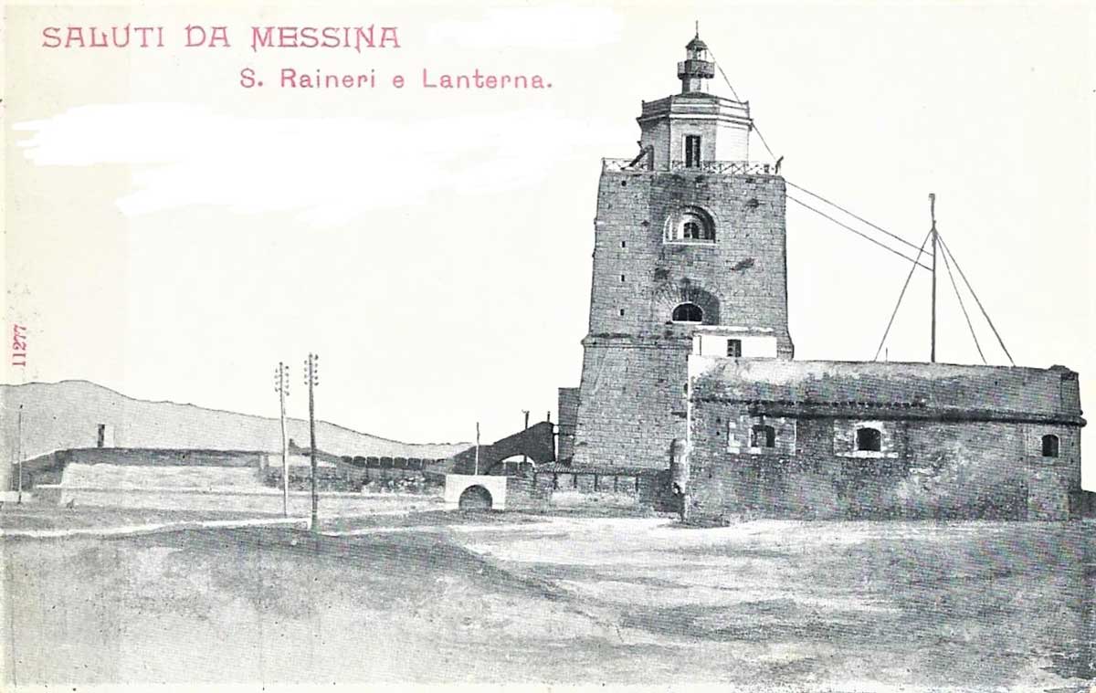 La Torre di San Raineri esisteva già nel sec. XIII, citata in un documento del 31 agosto 1273 contro le incursioni nemiche, conservato all’Archivio di Stato di Napoli. Non esisteva invece la lanterna, sostituita da fuochi (“fani”) di segnalazione. In un diploma del 26 giugno 1291 risulta che con la torre esisteva una chiesa dedicata a S. Raineri e la lanterna era accudita da Fra Giovanni da Messina con alcuni compagni. Nel 1310 la Torre prende ufficialmente il nome di “lanterna”. Edificata, l’attuale, nel 1555 su progetto dell’architetto e scultore toscano Giovan Angelo Montorsoli che probabilmente utilizzò parte della struttura della preesistente Torre risalente al XIII secolo, l‘immagine architettonica cinquecentesca della Lanterna è rimasta integra fino ad oggi, se si escludono la base fortificata con una spessa cortina muraria munita di aperture a feritoia, aggiunta dai francesi nel 1676 durante la rivolta antispagnola del 1674/78, e il corpo di fabbrica sommitale a pianta ottagonale regolare, intonacato a strisce bianche e nere che contiene il meccanismo della Lanterna costruito nell’800, sulla scia delle trasformazioni in fari delle antiche torri fortificate d’avvistamento.