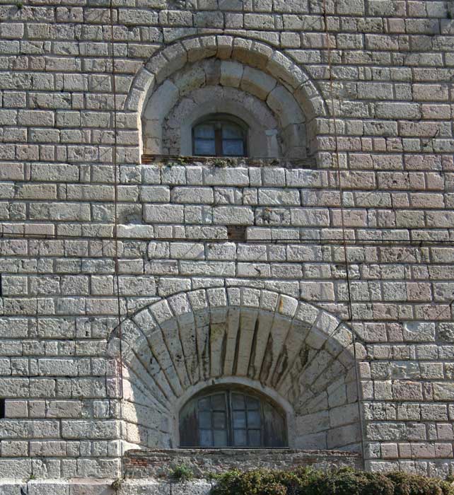 L’unica porta d’ingresso, sopraelevata, recava scolpita su una lapide marmorea andata perduta un’iscrizione dettata da Francesco Maurolico che faceva riferimento alla “Turrim Galofarum”: la denominazione si riferiva all’impetuoso gorgo che si forma ancora oggi presso la Torre della Lanterna e che è stato sempre comunemente inteso col nome dialettale “Galoffaru” (garofano).